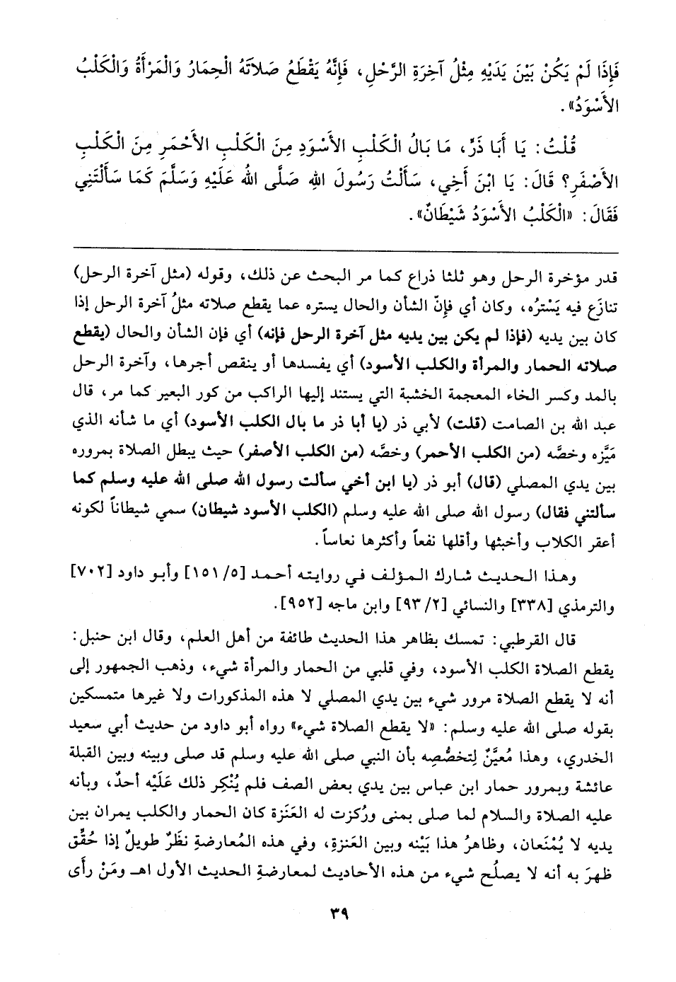 قال القرطبي: تمسك بظاهر هذا الحديث طائفة من أهل العلم، وقال ابن حنبل: يقطع الصلاة الكلب الأسود، وفي قلبي من الحمار والمرأة شيء، وذهب الجمهور إلى أنه لا يقطع الصلاة مرور شيء بين يدي المصلي لا هذه المذكورات ولا غيرها متمسكين بقوله صلى الله عليه وسلم: "لا يقطع الصلاة شيء" رواه أبو داود من حديث أبي سعيد الخدري، وهذا مُعيَّنٌ لِتخصُّصِه بأن النبي صلى الله عليه وسلم قد صلى وبينه وبين القبلة عائشة وبمرور حمار ابن عباس بين يدي بعض الصف فلم يُنْكِر ذلك عَلَيه أحدٌ، وبأنه عليه الصلاة والسلام لما صلى بمنى ورُكزت له العَنَزة كان الحمار والكلب يمران بين يديه لا يُمْنَعان، وظاهرُ هذا بَينه وبين العَنزةِ، وفي هذه المُعارضةِ نظَرٌ طويلٌ إذا حُقًق ظهرَ به أنه لا يصلُح شيء من هذه الأحاديث لمعارضةِ الحديث الأول اهـ ومَنْ رأَى