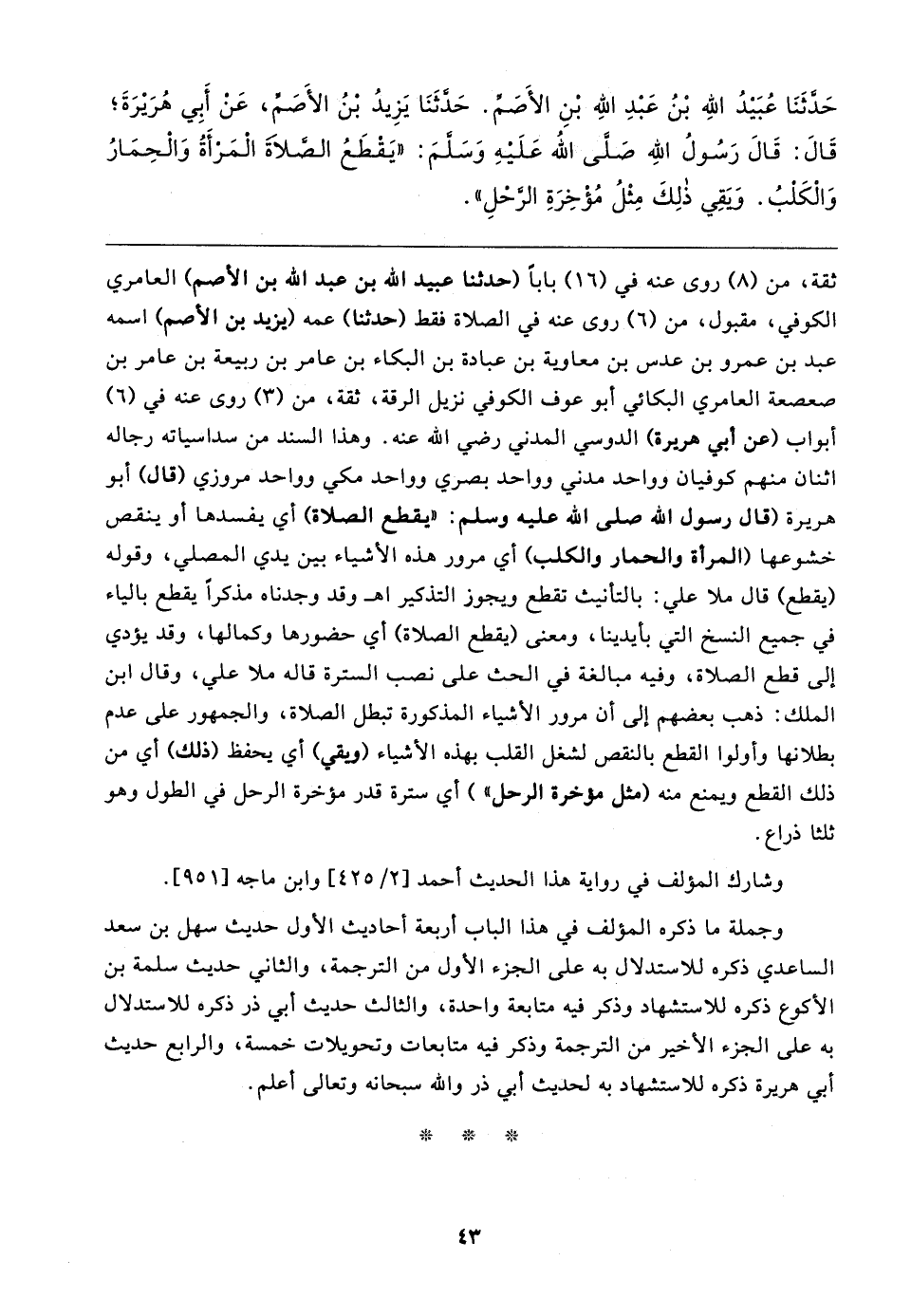 حَدَّثَنَا عُبَيدُ الله بْنُ عَبْدِ الله بْنِ الأَصَمِّ. حَدَّثَنَا يَزِيدُ بن الأَصَمِّ، عَنْ أَبِي هُرَيرَةَ؛ قَال: قَال رَسُولُ الله صَلَّى الله عَلَيهِ وَسَلَّمَ: "يَقطَعُ الصَّلاةَ الْمرْأَةُ وَالْحِمَارُ وَالْكَلْبُ. ويقِي ذلِكَ مِثْلُ مُؤْخِرَةِ الرَّحْلِ"