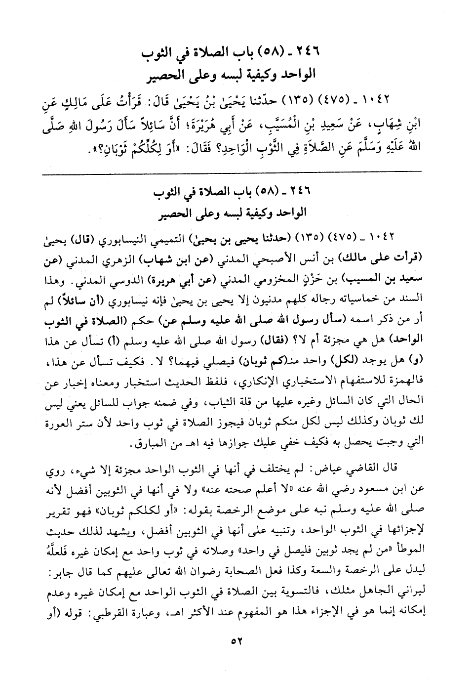 ١٠٤٢ - (٤٧٥) (١٣٥) حدَّثنا يَحيَى بْنُ يَحيَى قَال: قَرَأْتُ عَلَى مَالِكٍ عَنِ ابْنِ شِهَابٍ، عَنْ سَعِيدِ بْنِ الْمُسيَّبِ، عَنْ أَبِي هُرَيرَةَ؛ أَنَّ سَائِلًا سَأَلَ رَسُولَ اللهِ صَلَّى اللهُ عَلَيهِ وَسَلَّمَ عَنِ الصَّلاةِ فِي الثَّوْبِ الْوَاحِدِ؟ فَقَال: "أوَ لِكُلِّكُمْ ثَوْبَانِ؟ "