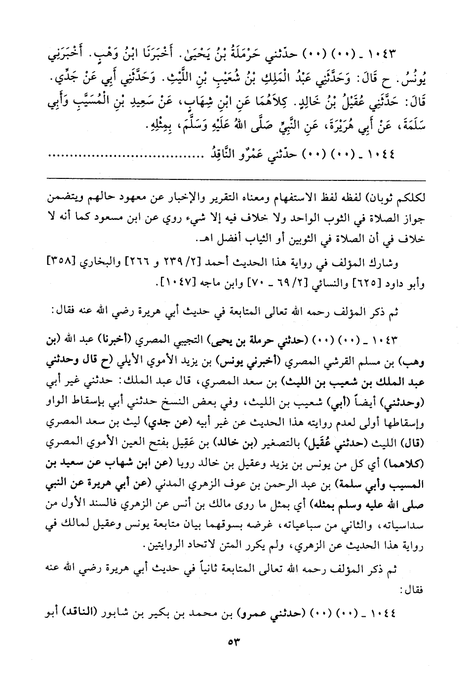 ١٠٤٣ - (٠٠) (٠٠) (حدثني حرملة بن يحيى) التجيبي المصري (أخبرنا) عبد الله (بن وهب) بن مسلم القرشي المصري (أخبرني يونس) بن يزيد الأموي الأيلي (ح قال وحدثني عبد الملك بن شعيب بن الليث) بن سعد المصري، قال عبد الملك: حدثني غير أبي (وحدثني) أيضًا (أبي) شعيب بن الليث، وفي بعض النسخ حدثني أبي بإسقاط الواو وإسقاطها أولى لعدم روايته هذا الحديث عن غير أبيه (عن جدي) ليث بن سعد المصري (قال) الليث (حدثني عُقَيل) بالتصغير (بن خالد) بن عَقِيل بفتح العين الأموي المصري (كلاهما) أي كل من يونس بن يزيد وعقيل بن خالد رويا (عن ابن شهاب عن سعيد بن المسيب وأبي سلمة) بن عبد الرحمن بن عوف الزهريّ المدني (عن أبي هريرة عن النبي صلى الله عليه وسلم بمثله) أي بمثل ما روى مالك بن أنس عن الزهري فالسند الأول من سداسياته، والثاني من سباعياته، غرضه بسوقهما بيان متابعة يونس وعقيل لمالك في رواية هذا الحديث عن الزهري، ولم يكرر المتن لاتحاد الروايتين.