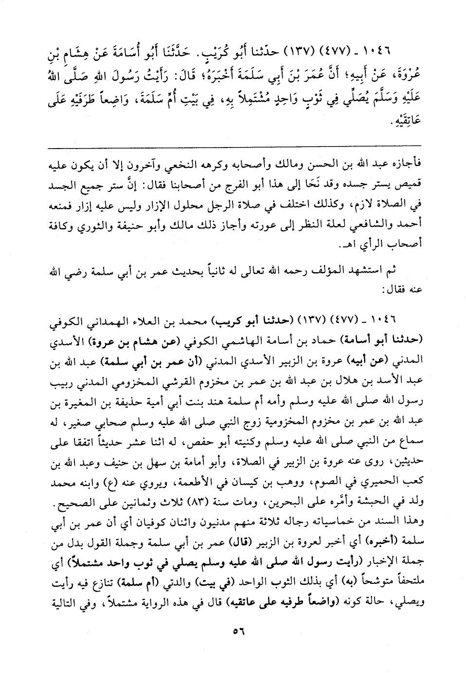 ١٠٤٦ - (٤٧٧) (١٣٧) حدَّثنا أَبُو كُرَيبٍ. حَدَّثَنَا أَبُو أُسَامَةَ عَنْ هِشَامِ بْنِ عُرْوَةَ، عَنْ أَبِيهِ؛ أَنَّ عُمَرَ بْنَ أَبِي سَلَمَةَ أَخْبَرَهُ؛ قَال: رَأَيتُ رَسُولَ اللهِ صَلَّى اللهُ عَلَيهِ وَسَلَّمَ يُصَلِّي فِي ثَوْبٍ وَاحِدٍ مُشْتَمِلًا بِهِ، فِي بَيتِ أُمِّ سَلَمَةَ، وَاضعًا طَرَفَيهِ عَلَى عَاتِقَيهِ