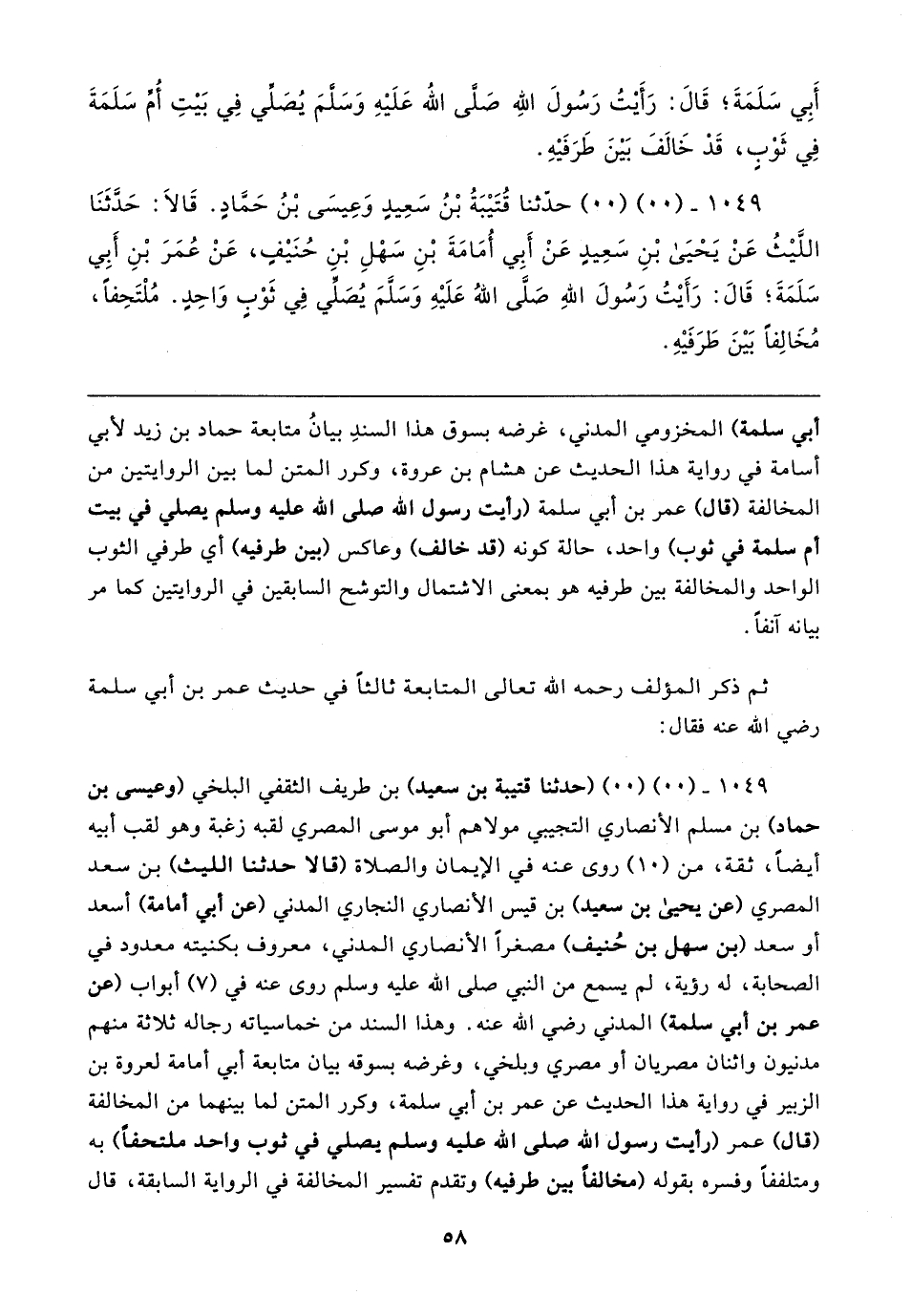 ١٠٤٩ - (٠٠) (٠٠) (حدثنا قتيبة بن سعيد) بن طريف الثقفي البلخي (وعيسى بن حماد) بن مسلم الأنصاري التجيبي مولاهم أبو موسى المصري لقبه زغبة وهو لقب أبيه أيضًا، ثقة، من (١٠) روى عنه في الإيمان والصلاة (قال حدثنا الليث) بن سعد المصري (عن يحيى بن سعيد) بن قيس الأنصاري النجاري المدني (عن أبي أمامة) أسعد أو سعد (بن سهل بن حُنيف) مصغرًا الأنصاري المدني، معروف بكنيته معدود في الصحابة، له رؤية، لم يسمع من النبي صلى الله عليه وسلم روى عنه في (٧) أبواب (عن عمر بن أبي سلمة) المدني رضي الله عنه. وهذا السند من خماسياته رجاله ثلاثة منهم مدنيون واثنان مصريان أو مصري وبلخي، وغرضه بسوقه بيان متابعة أبي أمامة لعروة بن الزبير في رواية هذا الحديث عن عمر بن أبي سلمة، وكرر المتن لما بينهما من المخالفة (قال) عمر (رأيت رسول الله صلى الله عليه وسلم يصلي في ثوب واحد ملتحفًا) به ومتلففًا وفسره بقوله (مخالفًا بين طرفيه) وتقدم تفسير المخالفة في الرواية السابقة، قال