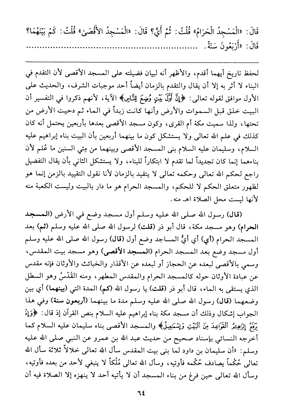 قَال: "الْمَسْجِدُ الْحَرَامُ" قُلْتُ: ثُم أَيٌّ؟ قَال: "الْمَسْجِدُ الأقصَى" قلت: كم بَينَهُمَا؟ قَال: "أَرْبَعُونَ سَنَةً،