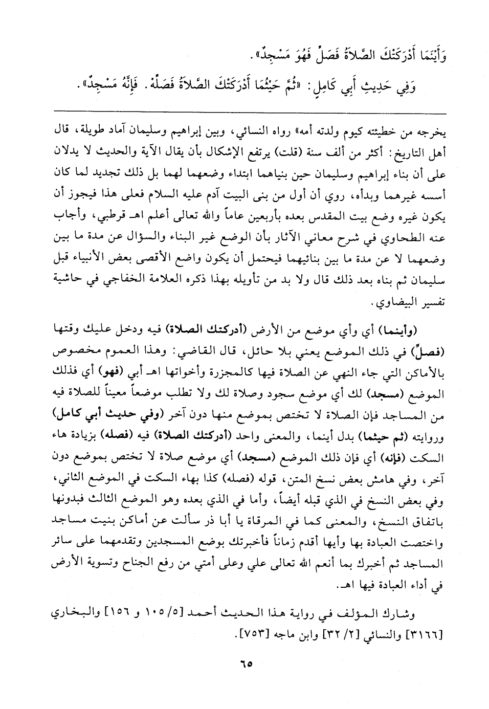 وَفِي حَدِيثِ أَبِي كَامِلٍ: "ثُمَّ حَيثُمَا أَدْرَكَتْكَ الصَّلاةُ فَصَلِّهْ. فَإنَّهُ مَسْجِدٌ"
