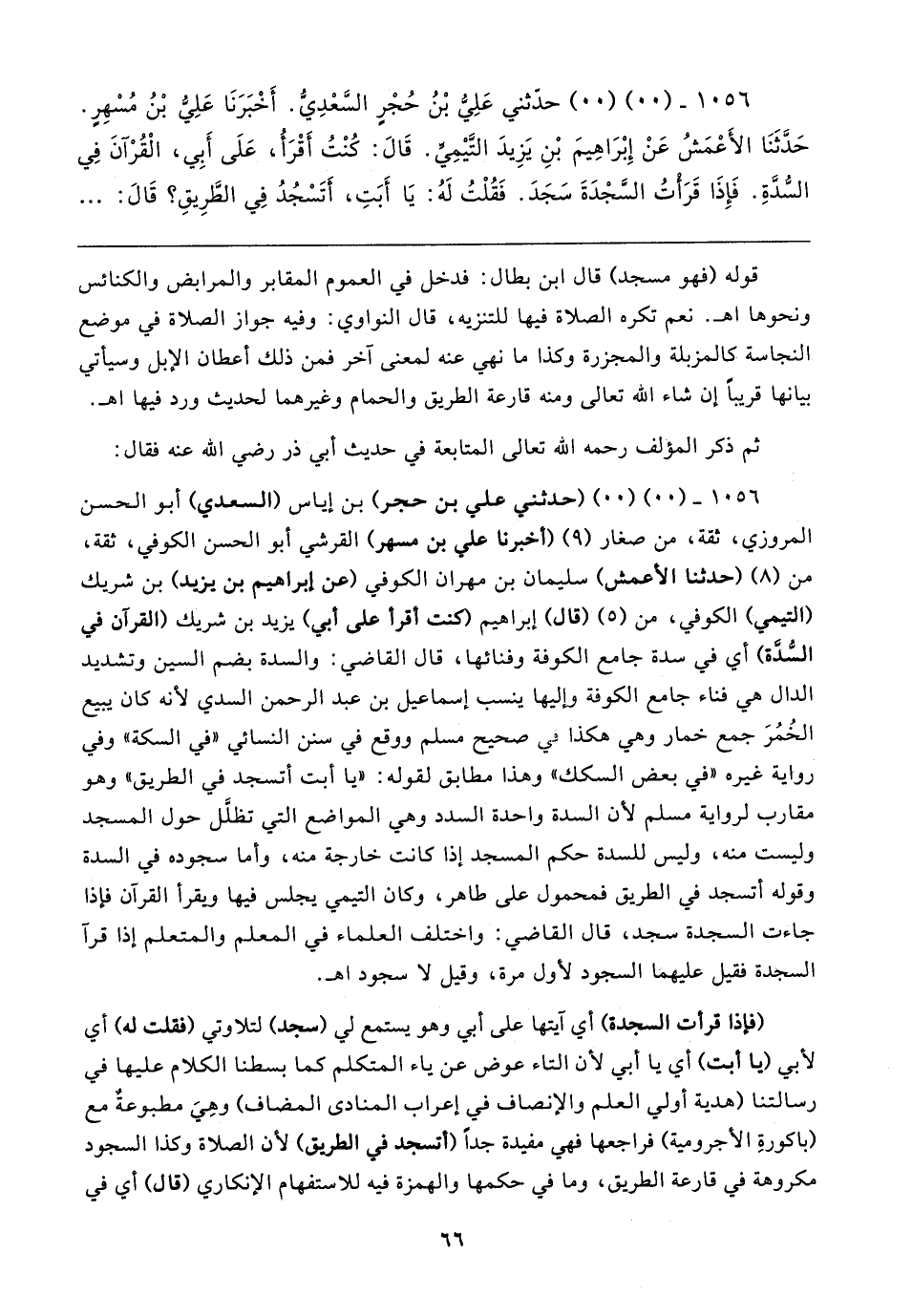 ١٠٥٦ - (٠٠) (٠٠) حدّثني عَلِي بْنُ حُجْرٍ السعدِيُّ. أخْبَرَنَا عَلِي بْنُ مُسْهِرٍ. حَدَّثَنَا الأعمَشُ عَنْ إِبْرَاهِيمَ بْنِ يَزِيدَ التَّيمِي. قَال: كُنْتُ أَقْرَأُ، عَلَى أَبِي، الْقُرآنَ فِي السُّدَّةِ. فَإِذَا قَرَأتُ السجْدَةَ سَجَدَ. فَقُلْتُ لَهُ: يَا أَبَتِ، أَتَسْجُدُ فِي الطرِيقِ؟ قَال: