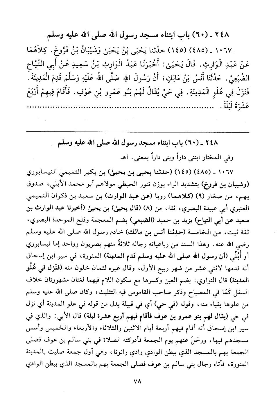 ١٠٦٧ - (٤٨٥) (١٤٥) (حدثنا يحيى بن يحيى) بن بكير التميمي النيسابوري (وشيبان بن فروخ) بتشديد الراء بوزن تنور الحبطي مولاهم أبو محمد الأبلي، صدوق يهم، من صغار (٩) (كلاهما) رويا (عن عبد الوارث) بن سعيد بن ذكوان التميمي العنبري أبي عبيدة البصري، ثقة، من (٨) (قال يحيى) بن يحيى (أخبرنا عبد الوارث بن سعيد عن أبي التياح) يزيد بن حميد (الضبعي) بضم المعجمة وفتح الموحدة البصري، ثقة ثبت، من الخامسة (حدثنا أنس بن مالك) خادم رسول الله صلى الله عليه وسلم رضي الله عنه. وهذا السند من رباعياته رجاله ثلاثةٌ منهم بصريون وواحد إما نيسابوري أو أُبُلِّي (أن رسول الله صلى الله عليه وسلم قدم المدينة) المنورة، في سير ابن إسحاق أنه قدمها لاثني عشر من شهر ربيع الأول، وقال غيره لثمان خلون منه (فنَزل في عُلْو المدينة) قال النواوي: بضم العين وكسرها مع سكون اللام فيهما لغتان مشهورتان خلاف السفل كَمَا في المصباح وذكر صاحب القاموس فيه التئليث، وكان صلى الله عليه وسلم من علوها بقباء منه، وقوله (في حي) أي في قبيلة بدل من قوله في علو المدينة أي نزل في حي (يقال لهم بنو عمرو بن عوف فأقام فيهم أربع عشرة ليلة) قال الأبي: والذي في سير ابن إسحاق أنه أقام فيهم أربعة أيام الاثنين والثلاثاء والأربعاء والخميس وأسس مسجدهم فيها، ورحَلَ عنهم يوم الجمعة فأدركته الصلاة في بني سالم بن عوف فصلى الجمعة بهم بالمسجد الذي ببطن الوادي وادي رانونا، وهي أول جمعة صليت بالمدينة المنورة، فأتاه رجال بني سالم بن عوف فصلى الجمعة بهم بالمسجد الذي ببطن الوادي