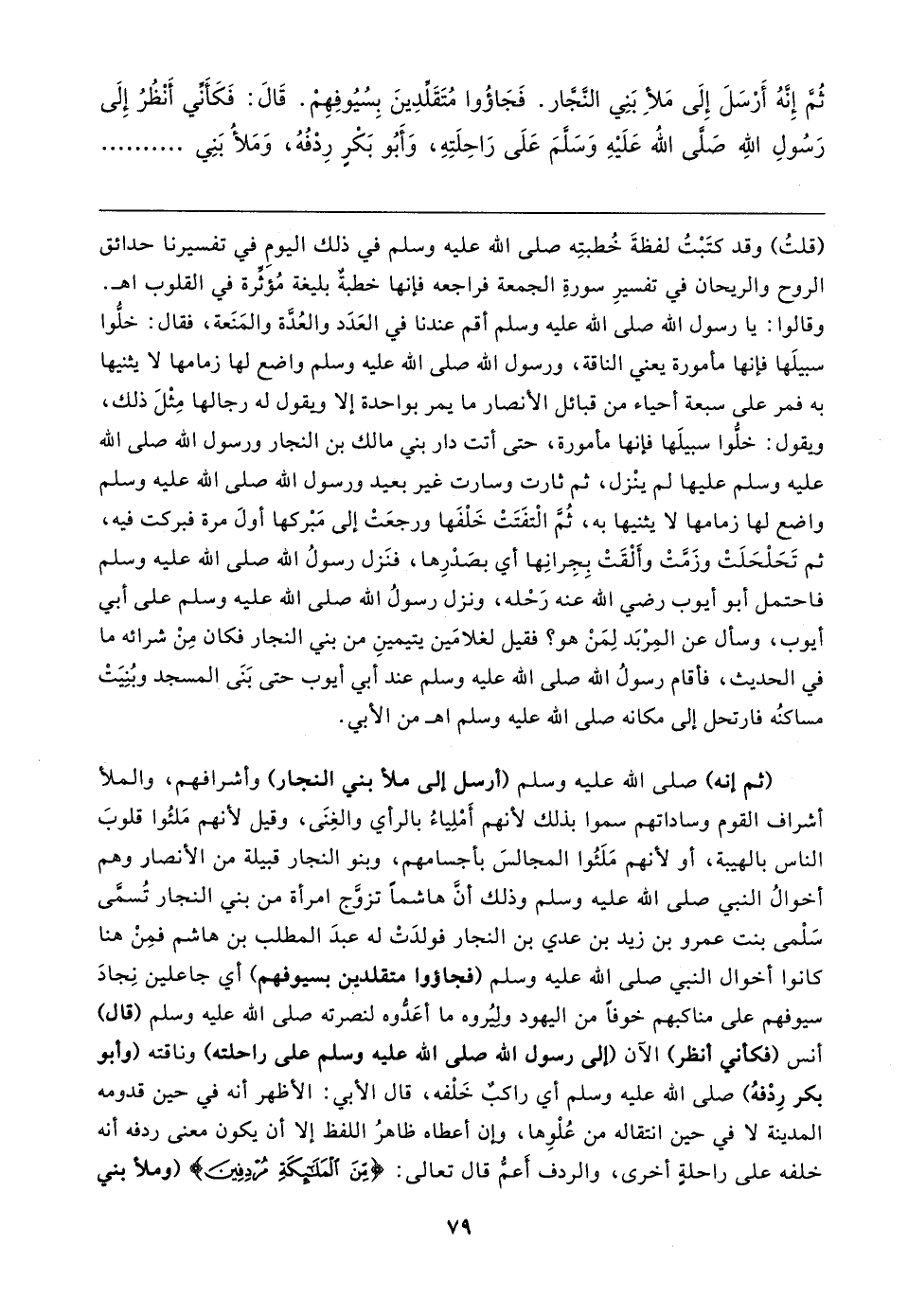 ثُمَّ إِنهُ أَرْسَلَ إِلَى ملأ بَنِي النَّجَّار. فَجَاؤُوا مُتَقَلِّدِينَ بِسُيُوفِهِم. قَال: فَكَأني أَنْظُرُ إِلَى رَسُولِ الله صَلى الله عَلَيهِ وَسَلمَ عَلَى رَاحِلَتِهِ، وَأبُو بَكْرٍ رِدفُهُ، وَمَلأُ بَنِي
