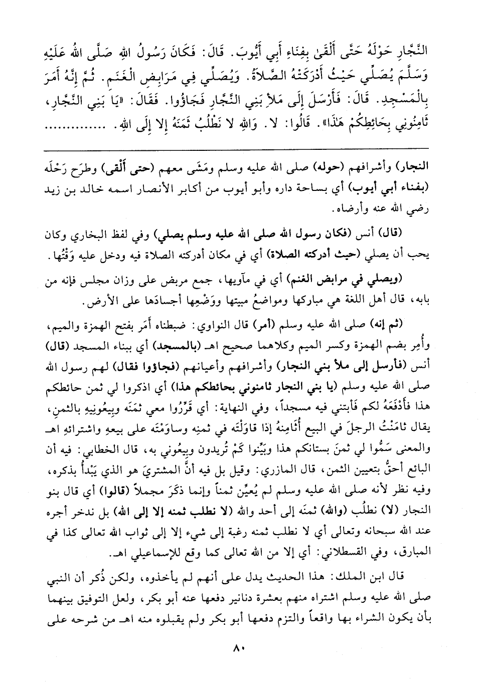 النَّجَّارِ حَوْلَهُ حَتى أَلْقَى بِفِنَاءِ أَبِي أَيُّوبَ. قَال: فَكَانَ رَسُولُ الله صَلَّى الله عَلَيهِ وَسَلَّمَ يُصلِّي حَيثُ أَدْرَكَتْهُ الصَّلاةُ. وَيُصَلِّي فِي مَرَابِضِ الْغَنَمِ. ثُمَّ إِنَّهُ أَمَرَ بِالْمَسْجِدِ. قَال: فَأَرْسَلَ إِلَى مَلأ بَنِي النَّجَّارِ فَجَاؤُوا. فَقَال: "يَا بَنِي النَّجَّارِ، ثَامِنُونِي بِحَائِطِكُمْ هَذَا". قَالُوا: لا. وَالله لا نَطْلُبُ ثَمَنَهُ إِلا إِلَى اللِّهِ