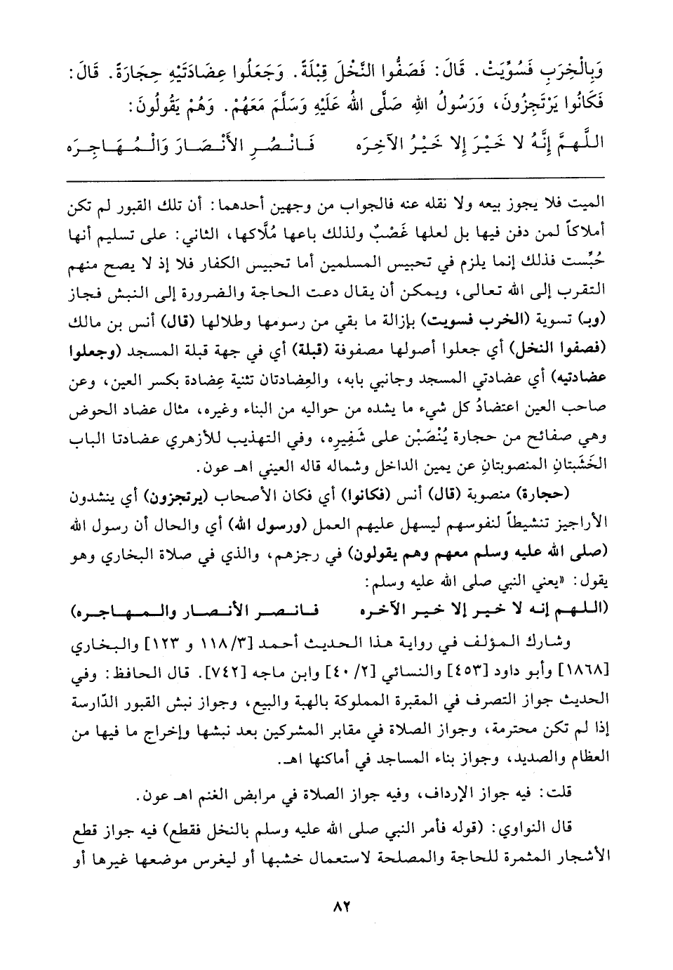 الميت فلا يجوز بيعه ولا نقله عنه فالجواب من وجهين أحدهما: أن تلك القبور لم تكن أملاكًا لمن دفن فيها بل لعلها غَصْبٌ ولذلك باعها مُلَّاكها، الثاني: على تسليم أنها حُبِّست فذلك إنما يلزم في تحبيس المسلمين أما تحبيس الكفار فلا إذ لا يصح منهم التقرب إلى الله تعالى، ويمكن أن يقال دعت الحاجة والضرورة إلى النبش فجاز (وبـ) تسوية (الخرب فسويت) بإزالة ما بقي من رسومها وطلالها (قال) أنس بن مالك (فصفوا النخل) أي جعلوا أصولها مصفوفة (قبلة) أي في جهة قبلة المسجد (وجعلوا عضادتيه) أي عضادتي المسجد وجانبي بابه، والعِضادتان تثنية عِضادة بكسر العين، وعن صاحب العين اعتضادُ كل شيء ما يشده من حواليه من البناء وغيره، مثال عضاد الحوض وهي صفائح من حجارة يُنْصَبْن على شَفِيرِه، وفي التهذيب للأزهري عضادتا الباب الخَشَبتانِ المنصوبتانِ عن يمين الداخل وشماله قاله العيني اهـ عون.