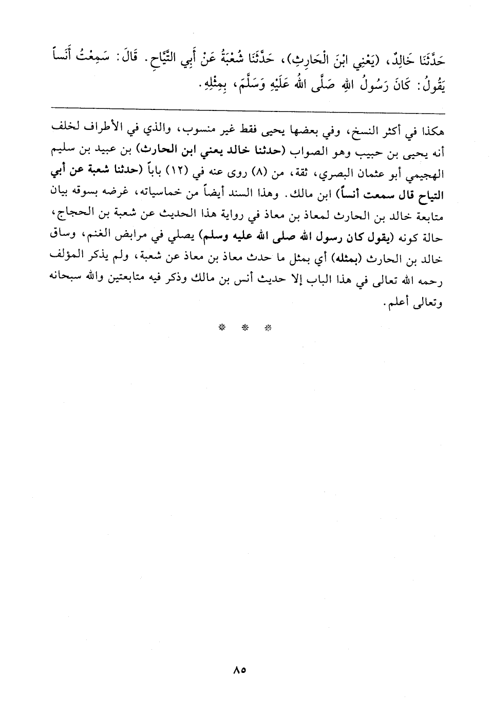 حَدَّثَنَا خَالِدٌ، (يَعْنِي ابْنَ الْحَارِثِ)، حَدَّثَنَا شُعْبَةُ عَنْ أَبِي التَّيَّاحِ. قَال: سَمِعْتُ أَنَسًا يَقُولُ: كَانَ رَسُولُ الله صَلَّى الله عَلَيهِ وَسَلَّمَ، بِمِثْلِهِ