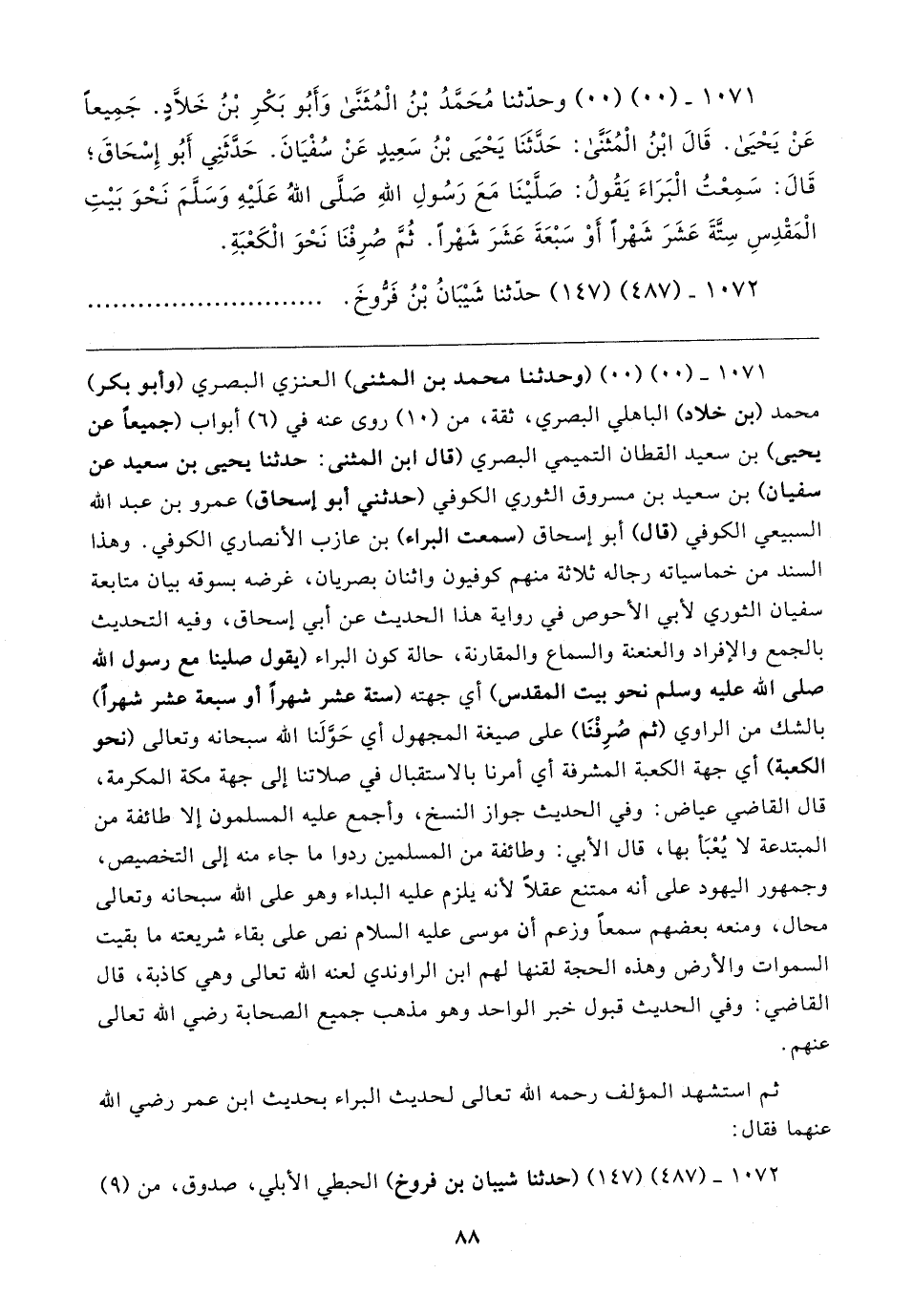 ١٠٧١ - (٠٠) (٠٠) وحدّثنا مُحَمَّدُ بْنُ الْمُثَنَّى وَأَبُو بَكْرِ بْنُ خَلَّادٍ. جَمِيعًا عَنْ يَحْيَى. قَال ابْنُ الْمُثَنَّى: حَدَّثَنَا يَحْيَى بْنُ سَعِيدٍ عَنْ سُفْيَانَ. حَدَّثَنِي أَبُو إِسْحَاقَ؛ قَال: سَمِعْتُ الْبَرَاءَ يَقُولُ: صَلَّينَا مَعَ رَسُولِ اللهِ صَلَّى اللهُ عَلَيهِ وَسَلَّمَ نَحْوَ بَيتِ الْمَقْدِسِ سِتَّةَ عَشَرَ شَهْرًا أَوْ سَبْعَةَ عَشَرَ شَهْرًا. ثُمَّ صُرِفْنَا نَحْوَ الْكَعْبَةِ.