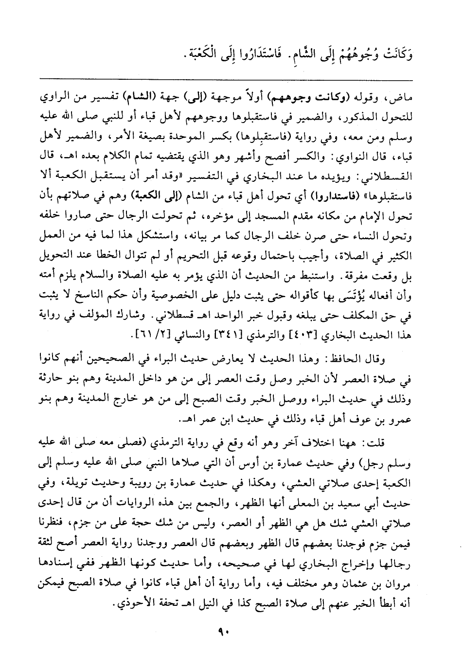 وقال الحافظ: وهذا الحديث لا يعارض حديث البراء في الصحيحين أنهم كانوا في صلاة العصر لأن الخبر وصل وقت العصر إلى من هو داخل المدينة وهم بنو حارثة وذلك في حديث البراء ووصل الخبر وقت الصبح إلى من هو خارج المدينة وهم بنو عمرو بن عوف أهل قباء وذلك في حديث ابن عمر اهـ.