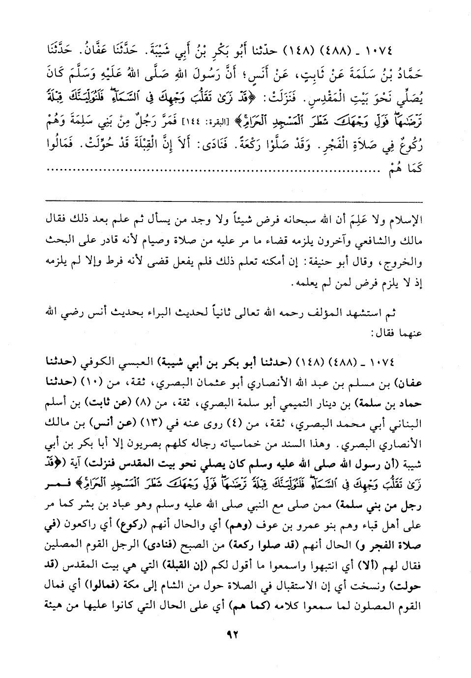 ١٠٧٤ - (٤٨٨) (١٤٨) (حدثنا أبو بكر بن أبي شيبة) العبسي الكوفي (حدثنا عفان) بن مسلم بن عبد الله الأنصاري أبو عثمان البصري، ثقة، من (١٠) (حدثنا حماد بن سلمة) بن دينار التميمي أبو سلمة البصري، ثقة، من (٨) (عن ثابت) بن أسلم البناني أبي محمد البصري، ثقة، من (٤) روى عنه في (١٣) (عن أنس) بن مالك الأنصاري البصري. وهذا السند من خماسياته رجاله كلهم بصريون إلا أبا بكر بن أبي شيبة (أن رسول الله صلى الله عليه وسلم كان يصلي نحو بيت المقدس فنزلت) آية {قَدْ نَرَى تَقَلُّبَ وَجْهِكَ فِي السَّمَاءِ فَلَنُوَلِّيَنَّكَ قِبْلَةً تَرْضَاهَا فَوَلِّ وَجْهَكَ شَطْرَ الْمَسْجِدِ الْحَرَامِ} فمر رجل من بني سلمة) ممن صلى مع النبي صلى الله عليه وسلم وهو عباد بن بشر كما مر على أهل قباء وهم بنو عمرو بن عوت (وهم) أي والحال أنهم (ركوع) أي راكعون (في صلاة الفجر و) الحال أنهم (قد صلوا ركعة) من الصبح (فنادى) الرجل القوم المصلين فقال لهم (ألا) أي انتبهوا واسمعوا ما أقول لكم (إن القبلة) التي هي بيت المقدس (قد حولت) ونسخت أي إن الاستقبال في الصلاة حول من الشام إلى مكة (فمالوا) أي فمال القوم المصلون لما سمعوا كلامه كما هم) أي على الحال التي كانوا عليها من هيئة