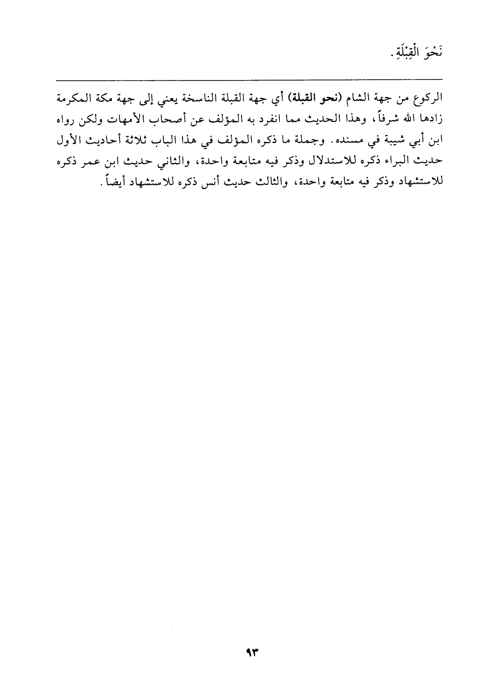 الركوع من جهة الشام (نحو القبلة) أي جهة القبلة الناسخة يعني إلى جهة مكة المكرمة زادها الله شرفًا، وهذا الحديث مما انفرد به المؤلف عن أصحاب الأمهات ولكن رواه ابن أبي شيبة في مسنده. وجملة ما ذكره المؤلف في هذا الباب ثلاثة أحاديث الأول حديث البراء ذكره للاستدلال وذكر فيه متابعة واحدة، والثاني حديث ابن عمر ذكره للاستشهاد وذكر فيه متابعة واحدة، والثالث حديث أنس ذكره للاستشهاد أيضًا.