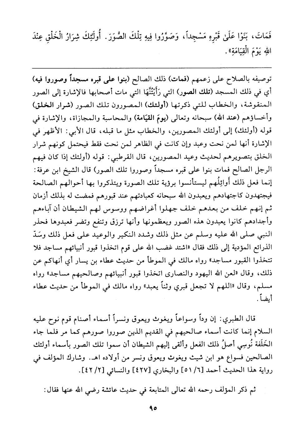 توصيفه بالصلاح على زعمهم (فمات) ذلك الصالح (بنوا على قبره مسجدًا وصوروا فيه) أي في ذلك المسجد (تلك الصور) التي رَأَيتُنَّهَا التي مات أصحابها فالإشارة إلى الصور المنقوشة، والخطاب للتي ذكرتها (أولئك) المصورون تلك الصور (شرار الخلق) وأخساؤهم (عند الله) سبحانه وتعالى (يومَ القيَامة) والمحاسبة والمجازاة، والإشارة في قوله (أولئك) إلى أولئك المصورين، والخطاب مثل ما قبله، قال الأبي: الأظهر في الإشارة أنها لمن نحت وعبد وإن كانت في الظاهر لمن نحت فقط فيحتمل كونهم شرار الخلق بتصويرهم لحديث وعيد المصورين، قال القرطبي: قوله (أولئك إذا كان فيهم الرجل الصالح فمات بنوا على قبره مسجدًا وصوروا تلك الصور) قال الشيخ ابن عرفة: إنما فعل ذلك أَوائِلُهم ليستأنسوا برؤية تلك الصورة ويتذكروا بها أحوالهم الصالحة فيجتهدون كاجتهادهم ويعبدون الله سبحانه كعبادتهم عند قبورهم فمضت له بذلك أزمان ثم إنهم خلف من بعدهم خلف جهلوا أغراضهم ووسوس لهم الشيطان أن آباءهم وأجدادهم كانوا يعبدون هذه الصور ويعظمونها وأنها ترزق وتنفع وتضر فعبدوها فحذر النبي صلى الله عليه وسلم عن مثل ذلك وشدد النكير والوعيد على فعل ذلك وسَدّ الذرائع المؤدية إلى ذلك فقال "اشتد غضب الله على قوم اتخذوا قبور أنبيائهم مساجد فلا تتخذوا القبور مساجد" رواه مالك في الموطأ من حديث عطاء بن يسار أي أنهاكم عن ذلك، وقال "لعن الله اليهود والنصارى اتخذوا قبور أنبيائهم وصالحيهم مساجد" رواه مسلم، وقال "اللهم لا تجعل قبري وثنًا يعبد" رواه مالك في الموطأ من حديث عطاء أيضًا.