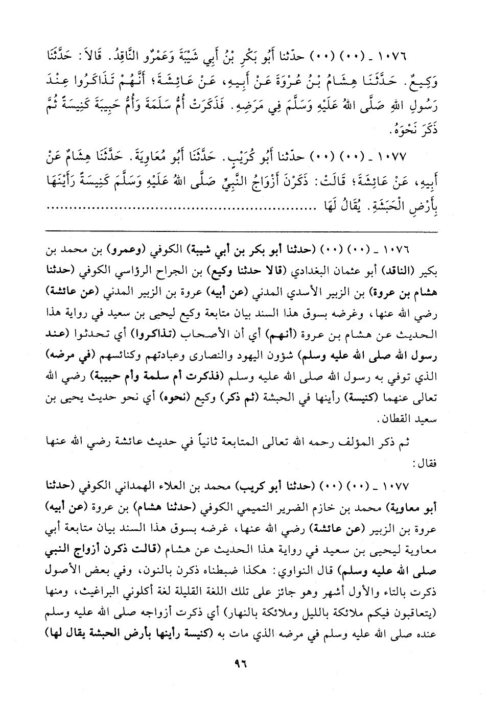 ١٠٧٧ - (٠٠) (٠٠) حدَّثنا أَبُو كُرَيبٍ. حَدَّثَنَا أَبُو مُعَاويَةَ. حَدَّثَنَا هِشَامٌ عَنْ أَبِيهِ، عَنْ عَائِشَةَ؛ قَالتْ: ذَكَرْنَ أَزْوَاجُ النَّبِيِّ صَلَّى اللهُ عَلَيهِ وَسَلَّمَ كَنِيسَةً رَأَينَهَا بِأَرْضِ الْحَبَشَةِ. يُقَالُ لَهَا