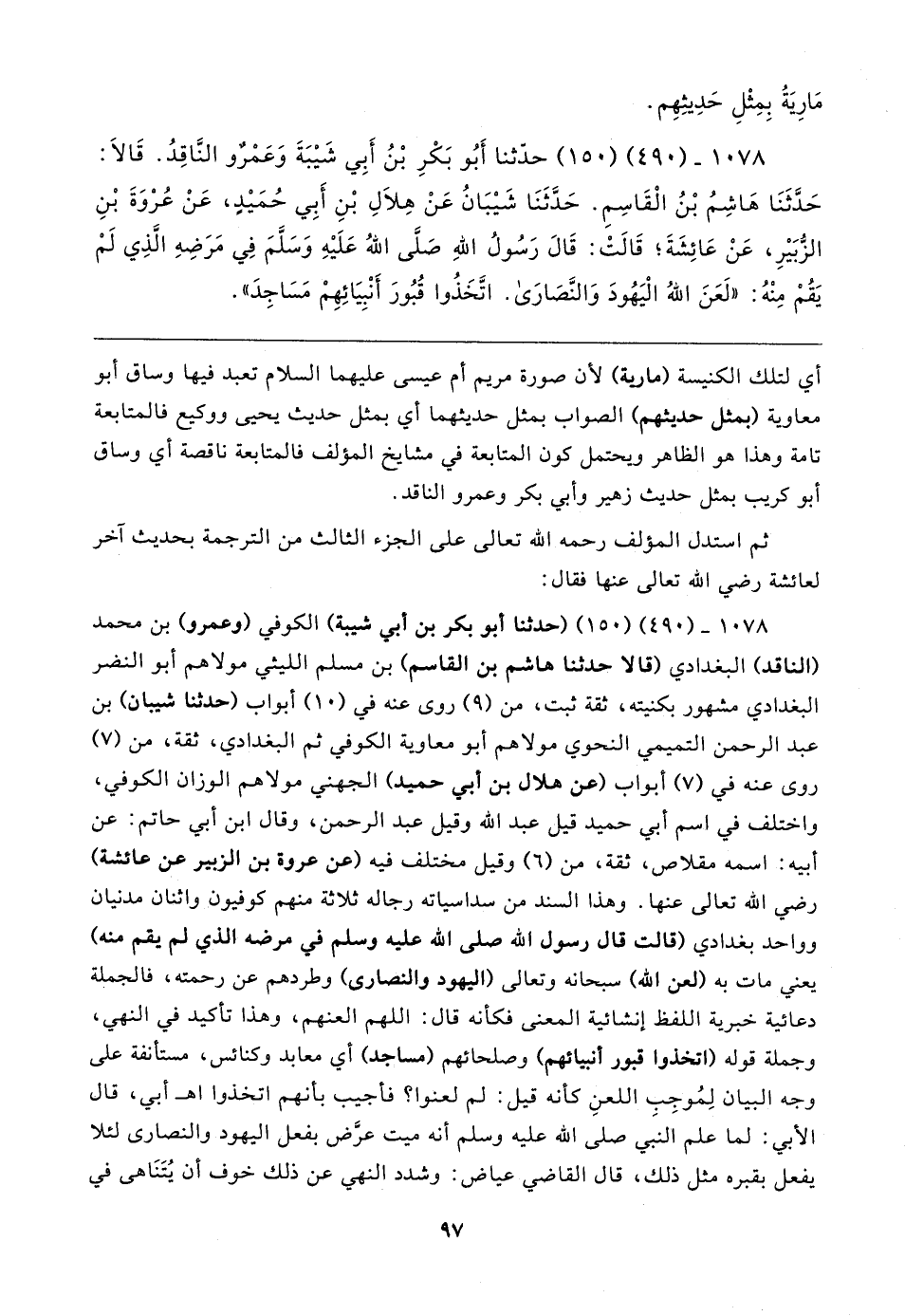 ١٠٧٨ - (٤٩٠) (١٥٠) (حدثنا أبو بكر بن أبي شيبة) الكوفي (وعمرو) بن محمد (الناقد) البغدادي (قالا حدثنا هاشم بن القاسم) بن مسلم الليثي مولاهم أبو النضر البغدادي مشهور بكنيته، ثقة ثبت، من (٩) روى عنه في (١٠) أبواب (حدثنا شيبان) بن عبد الرحمن التميمي النحوي مولاهم أبو معاوية الكوفي ثم البغدادي، ثقة، من (٧) روى عنه في (٧) أبواب (عن هلال بن أبي حميد) الجهني مولاهم الوزان الكوفي، واختلف في اسم أبي حميد قيل عبد الله وقيل عبد الرحمن، وقال ابن أبي حاتم: عن أبيه: اسمه مقلاص، ثقة، من (٦) وقيل مختلف فيه (عن عروة بن الزبير عن عائشة) رضي الله تعالى عنها. وهذا السند من سداسياته رجاله ثلاثة منهم كوفيون واثنان مدنيان وواحد بغدادي (قالت قال رسول الله صلى الله عليه وسلم في مرضه الذي لم يقم منه (يعني مات به العن الله) سبحانه وتعالى (اليهود والنصارى) وطردهم عن رحمته، فالجملة دعائية خبرية اللفظ إنشائية المعنى فكأنه قال: اللهم العنهم، وهذا تأكيد في النهي، وجملة قوله (اتخذوا قبور أنبيائهم) وصلحائهم (مساجد) أي معابد وكنائس، مستانفة على وجه البيان لِمُوجِبِ اللعنِ كأنه قيل: لم لعنوا؛ فأجيب بأنهم اتخذوا اهـ أبي، قال الأبي: لما علم النبي صلى الله عليه وسلم أنه ميت عرَّض بفعل اليهود والنصارى لئلا يفعل بقبره مثل ذلك، قال القاضي عياض: وشدد النهي عن ذلك خوف أن يُتَنَاهى في