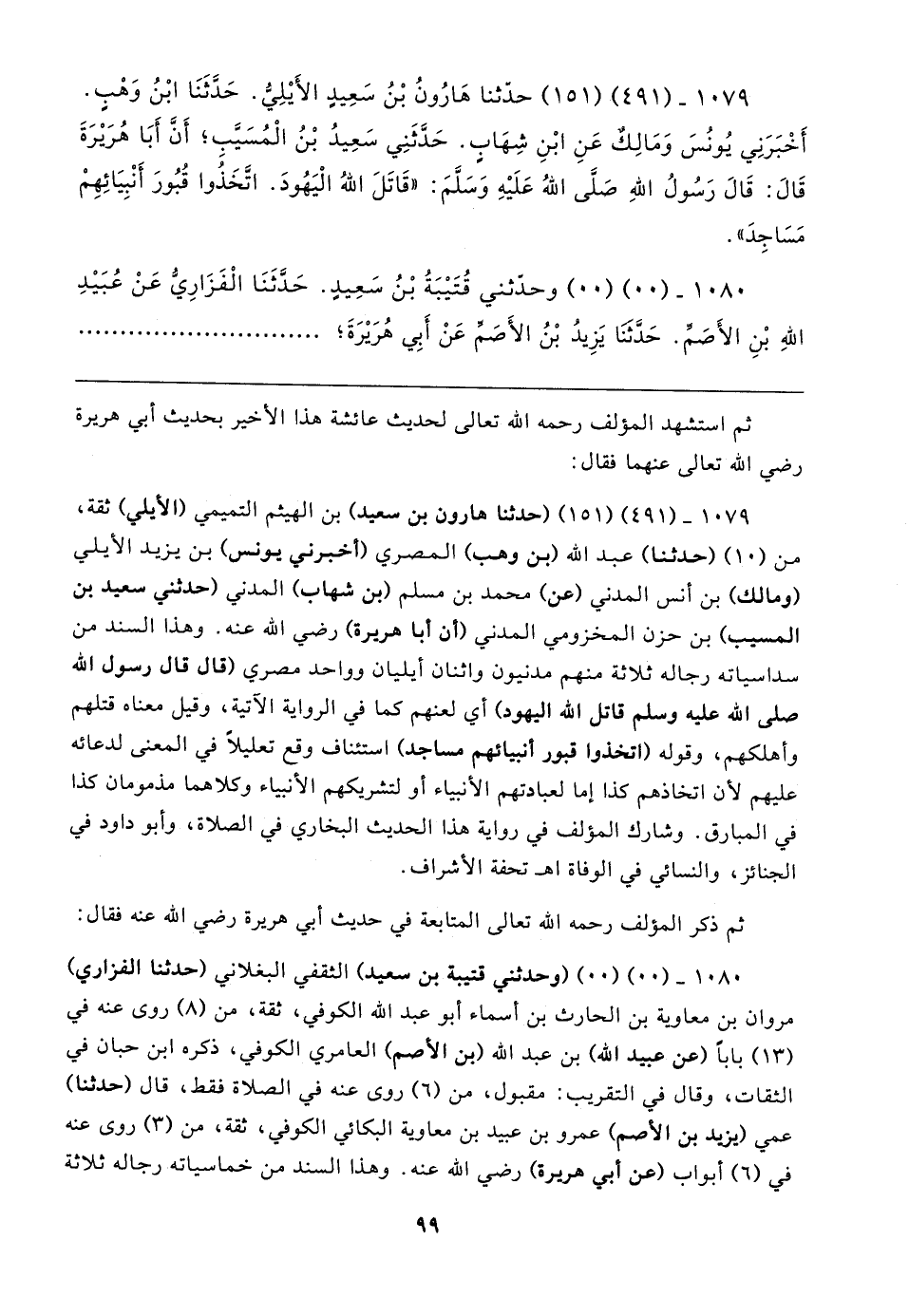 ١٠٧٩ - (٤٩١) (١٥١) (حدثنا هارون بن سعيد) بن الهيثم التميمي (الأيلي) ثقة، من (١٠) (حدثنا) عبد الله (بن وهب) المصري (أخبرني يونس) بن يزيد الأيلي (ومالك) بن أنس المدني (عن) محمد بن مسلم (بن شهاب) المدني (حدثني سعيد بن المسيب) بن حزن المخزومي المدني (أن أبا هريرة) رضي الله عنه. وهذا السند من سداسياته رجاله ثلاثة منهم مدنيون واثنان أيليان وواحد مصري (قال قال رسول الله صلى الله عليه وسلم قاتل الله اليهود) أي لعنهم كما في الرواية الآتية، وقيل معناه قتلهم وأهلكهم، وقوله (اتخذوا قبور أنبيائهم مساجد) استئناف وقع تعليلًا في المعنى لدعائه عليهم لأن اتخاذهم كذا إما لعبادتهم الأنبياء أو لتشريكهم الأنبياء وكلاهما مذمومان كذا في المبارق. وشارك المؤلف في رواية هذا الحديث البخاري في الصلاة، وأبو داود في الجنائز، والنسائي في الوفاة اهـ تحفة الأشراف.