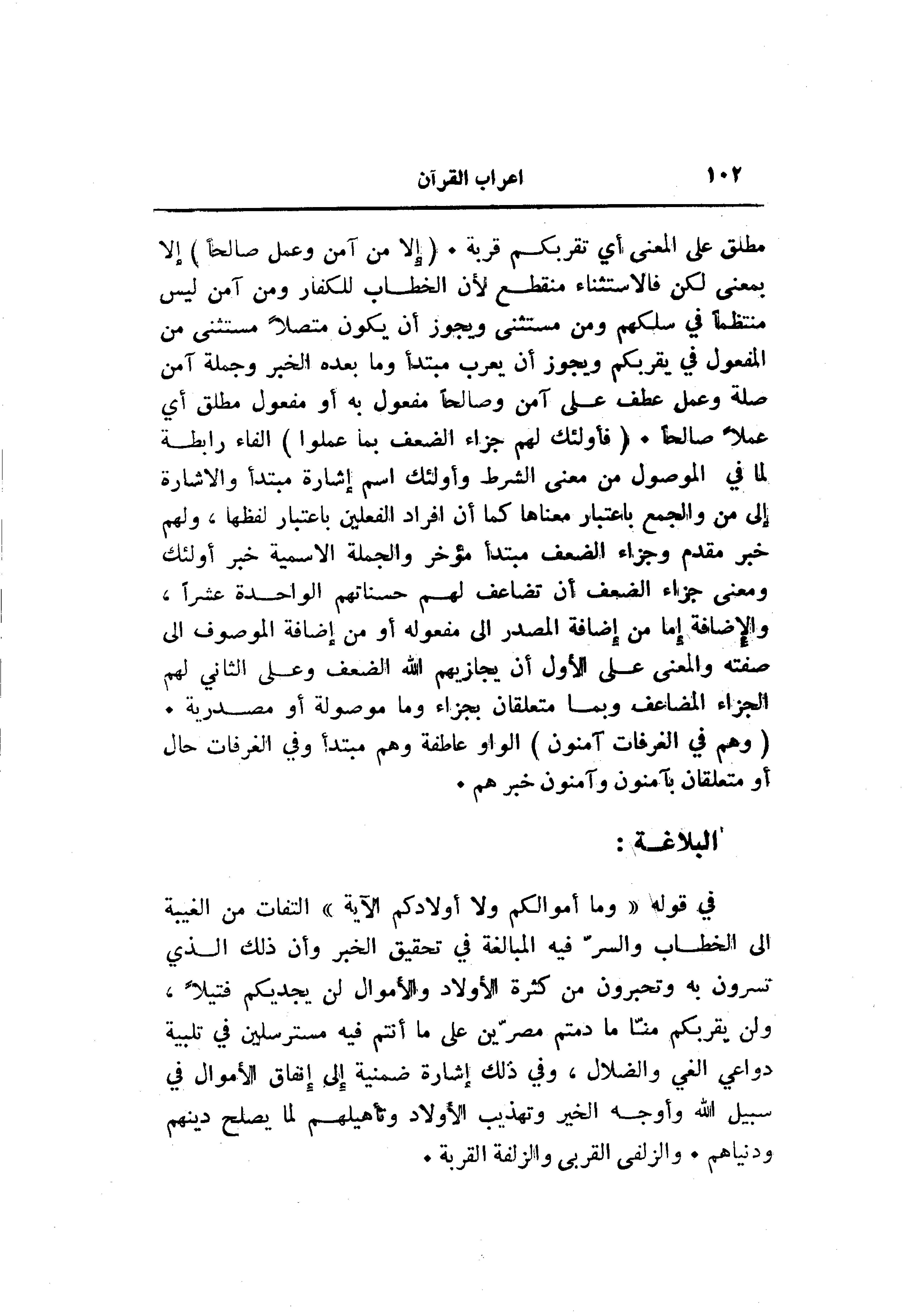 في قوله «وما أموالكم ولا أولادكم الآية» التفات من الغيبة الى الخطاب والسرّ فيه المبالغة في تحقيق الخبر وأن ذلك الذي تسرون به وتحبرون من كثرة الأولاد والأموال لن يجديكم فتيلا، ولن يقربكم منّا ما دمتم مصرّين على ما أنتم فيه مسترسلين في تلبية دواعي الغي والضلال، وفي ذلك إشارة ضمنية إلى إنفاق الأموال في سبيل الله وأوجه الخير وتهذيب الأولاد وتأهيلهم لما يصلح دينهم ودنياهم. والزلفى القربى والزلفة القربة.