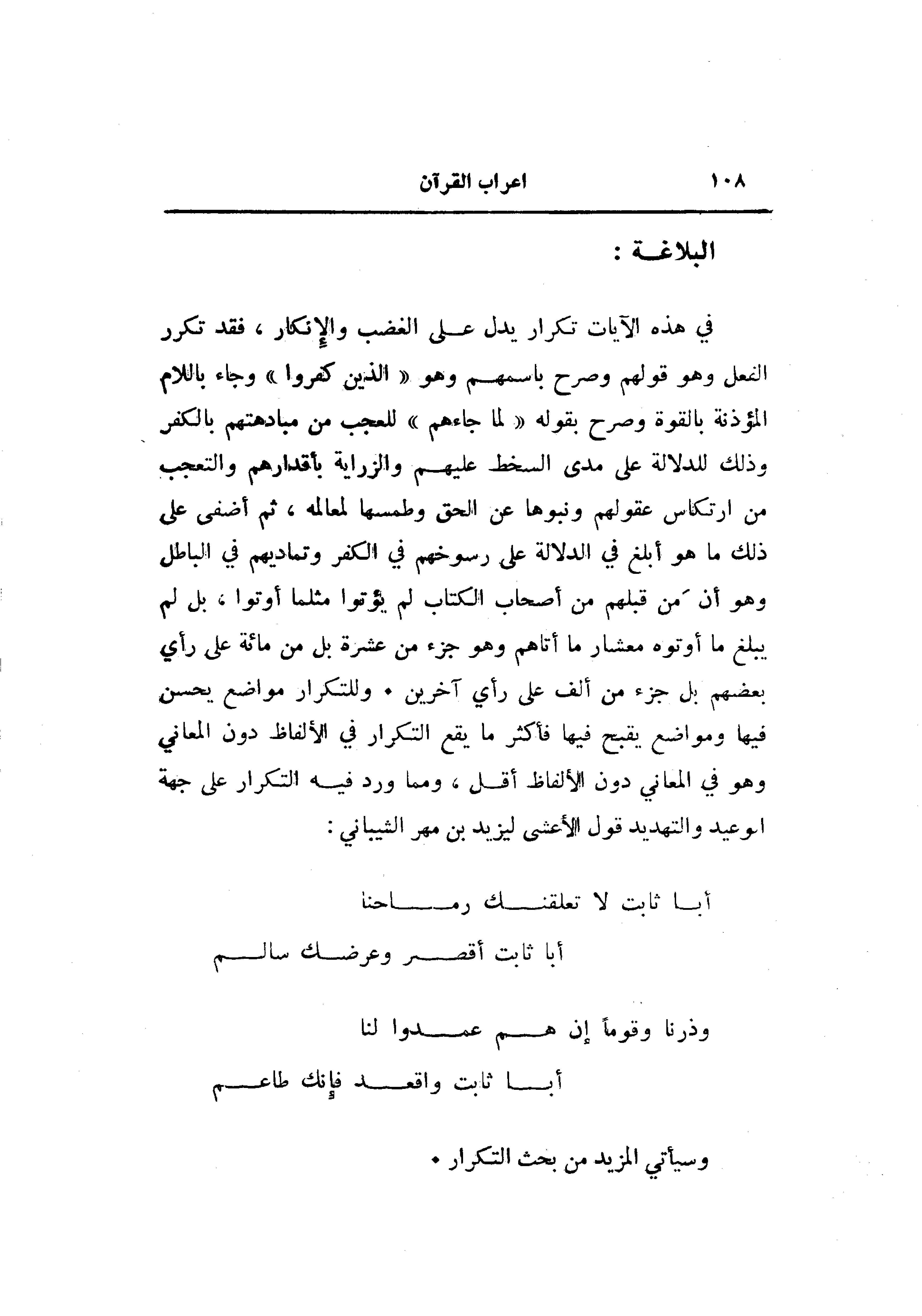 في هذه الآيات تكرار يدل على الغضب والإنكار، فقد تكرر الفعل وهو قولهم وصرح باسمهم وهو «الذين كفروا» وجاء باللام المؤذنة بالقوة وصرح بقوله «لما جاءهم» للعجب من مبادهتهم بالكفر وذلك للدلالة على مدى السخط عليهم والزراية بأقدارهم والتعجب من ارتكاس عقولهم ونبوها عن الحق وطمسها لمعالمه، ثم أضفى على ذلك ما هو أبلغ في الدلالة على رسوخهم في الكفر وتماديهم في الباطل وهو أن من قبلهم من أصحاب الكتاب لم يؤتوا مثلما أوتوا، بل لم يبلغ ما أوتوه معشار ما أتاهم وهو جزء من عشرة بل من مائة على رأي بعضهم بل جزء من ألف على رأي آخرين. وللتكرار مواضع يحسن فيها ومواضع يقبح فيها فأكثر ما يقع التكرار في الألفاظ دون المعاني وهو في المعاني دون الألفاظ أقل، ومما ورد فيه التكرار على جهة الوعيد والتهديد قول الأعشى ليزيد بن مهر الشيباني: