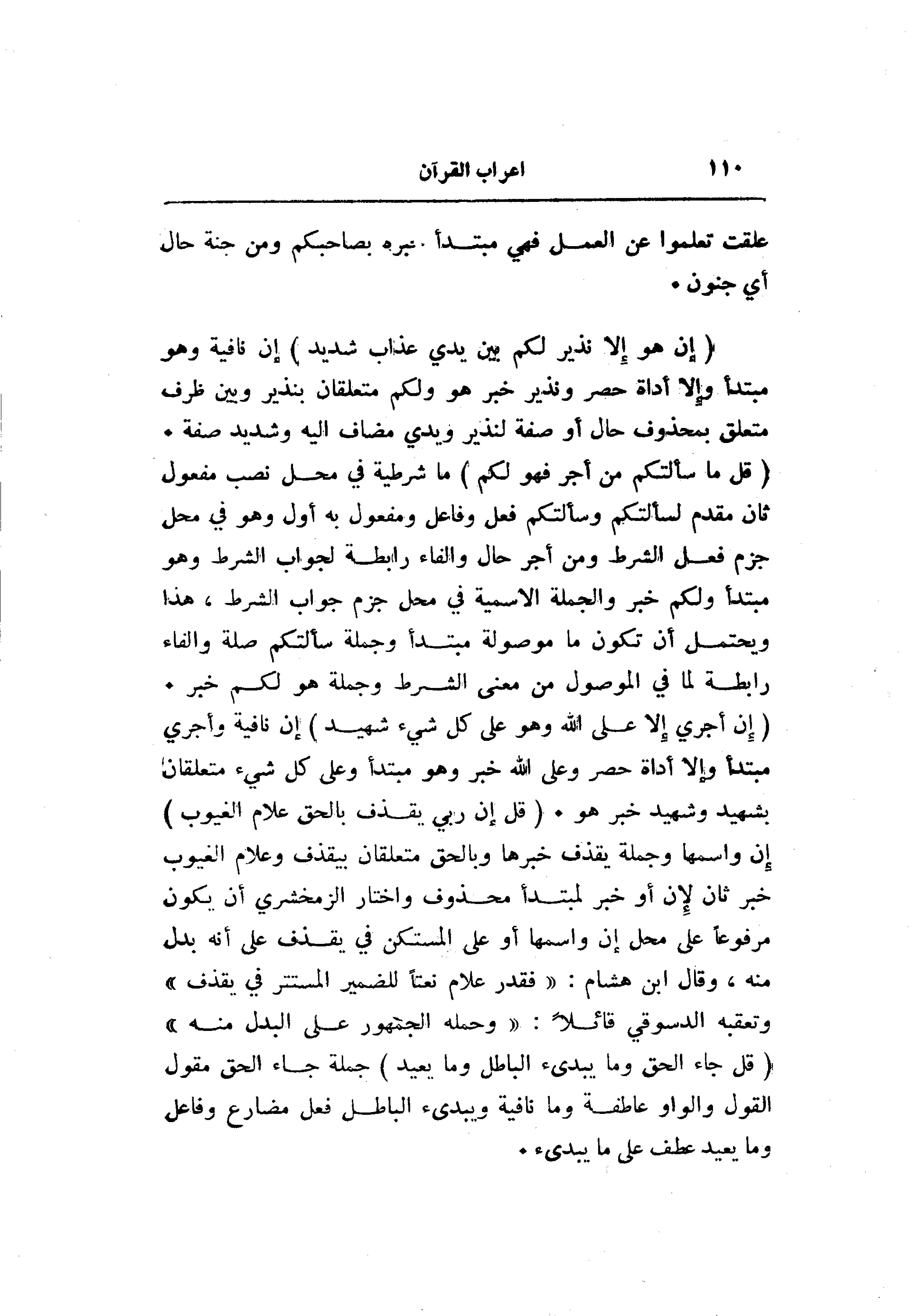 (إِنْ أَجْرِيَ إِلَّا عَلَى اللَّهِ وَهُوَ عَلى كُلِّ شَيْءٍ شَهِيدٌ) إن نافية وأجري مبتدأ وإلا أداة حصر وعلى الله خبر وهو مبتدأ وعلى كل شيء متعلقان بشهيد وشهيد خبر هو. (قُلْ إِنَّ رَبِّي يَقْذِفُ بِالْحَقِّ عَلَّامُ الْغُيُوبِ) إن واسمها وجملة يقذف خبرها وبالحق متعلقان بيقذف وعلام الغيوب خبر ثان لإن أو خبر لمبتدأ محذوف واختار الزمخشري أن يكون مرفوعا على محل إن واسمها أو على المستكن في يقذف على أنه بدل منه، وقال ابن هشام: «فقدر علام نعتا للضمير المستتر في يقذف» وتعقبه الدسوقي قائلا: «وحمله الجمهور على البدل منه» (قُلْ جاءَ الْحَقُّ وَما يُبْدِئُ الْباطِلُ وَما يُعِيدُ) جملة جاء الحق مقول القول والواو عاطفة وما نافية ويبدىء الباطل فعل مضارع وفاعل وما يعيد عطف على ما يبدىء.