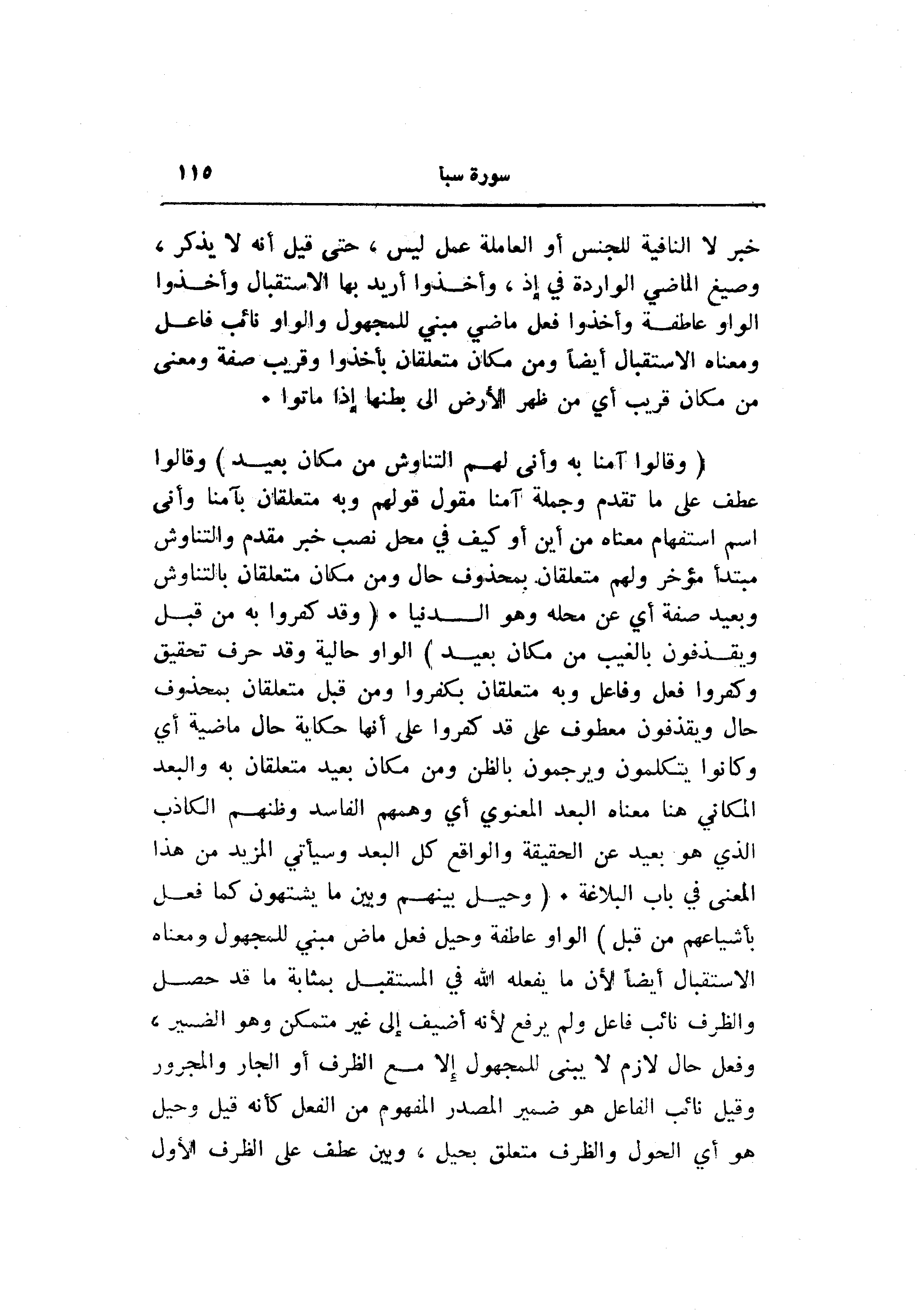 (وَقالُوا آمَنَّا بِهِ وَأَنَّى لَهُمُ التَّناوُشُ مِنْ مَكانٍ بَعِيدٍ) وقالوا عطف على ما تقدم وجملة آمنا مقول قولهم وبه متعلقان بآمنا وأنى اسم استفهام معناه من أين أو كيف في محل نصب خبر مقدم والتناوش مبتدأ مؤخر ولهم متعلقان بمحذوف حال ومن مكان متعلقان بالتناوش وبعيد صفة أي عن محله وهو الدنيا. (وَقَدْ كَفَرُوا بِهِ مِنْ قَبْلُ وَيَقْذِفُونَ بِالْغَيْبِ مِنْ مَكانٍ بَعِيدٍ) الواو حالية وقد حرف تحقيق وكفروا فعل وفاعل وبه متعلقان بكفروا ومن قبل متعلقان بمحذوف حال ويقذفون معطوف على قد كفروا على أنها حكاية حال ماضية أي وكانوا يتكلمون ويرجمون بالظن ومن مكان بعيد متعلقان به والبعد المكاني هنا معناه البعد المعنوي أي وهمهم الفاسد وظنهم الكاذب الذي هو بعيد عن الحقيقة والواقع كل البعد وسيأتي المزيد من هذا المعنى في باب البلاغة. (وَحِيلَ بَيْنَهُمْ وَبَيْنَ ما يَشْتَهُونَ كَما فُعِلَ بِأَشْياعِهِمْ مِنْ قَبْلُ) الواو عاطفة وحيل فعل ماض مبني للمجهول ومعناه الاستقبال أيضا لأن ما يفعله الله في المستقبل بمثابة ما قد حصل والظرف نائب فاعل ولم يرفع لأنه أضيف إلى غير متمكن وهو الضمير، وفعل حال لازم لا يبنى للمجهول إلا مع الظرف أو الجار والمجرور وقيل نائب الفاعل هو ضمير المصدر المفهوم من الفعل كأنه قيل وحيل هو أي الحول والظرف متعلق بحيل، وبين عطف على الظرف الأول