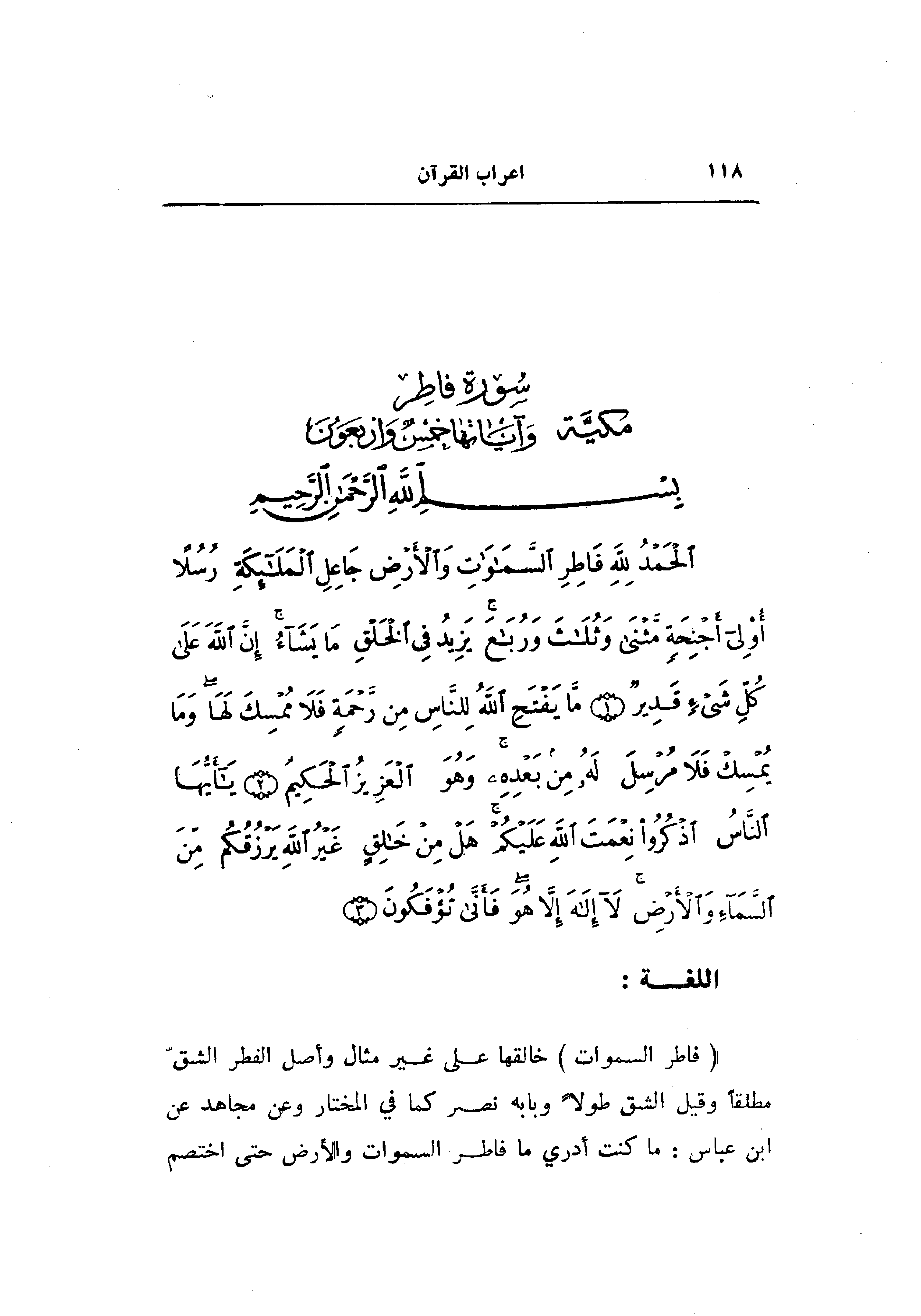 الْحَمْدُ لِلَّهِ فاطِرِ السَّماواتِ وَالْأَرْضِ جاعِلِ الْمَلائِكَةِ رُسُلاً أُولِي أَجْنِحَةٍ مَثْنى وَثُلاثَ وَرُباعَ يَزِيدُ فِي الْخَلْقِ ما يَشاءُ إِنَّ اللَّهَ عَلى كُلِّ شَيْءٍ قَدِيرٌ (1) ما يَفْتَحِ اللَّهُ لِلنَّاسِ مِنْ رَحْمَةٍ فَلا مُمْسِكَ لَها وَما يُمْسِكْ فَلا مُرْسِلَ لَهُ مِنْ بَعْدِهِ وَهُوَ الْعَزِيزُ الْحَكِيمُ (2) يا أَيُّهَا النَّاسُ اذْكُرُوا نِعْمَتَ اللَّهِ عَلَيْكُمْ هَلْ مِنْ خالِقٍ غَيْرُ اللَّهِ يَرْزُقُكُمْ مِنَ السَّماءِ وَالْأَرْضِ لا إِلهَ إِلاَّ هُوَ فَأَنَّى تُؤْفَكُونَ (3)