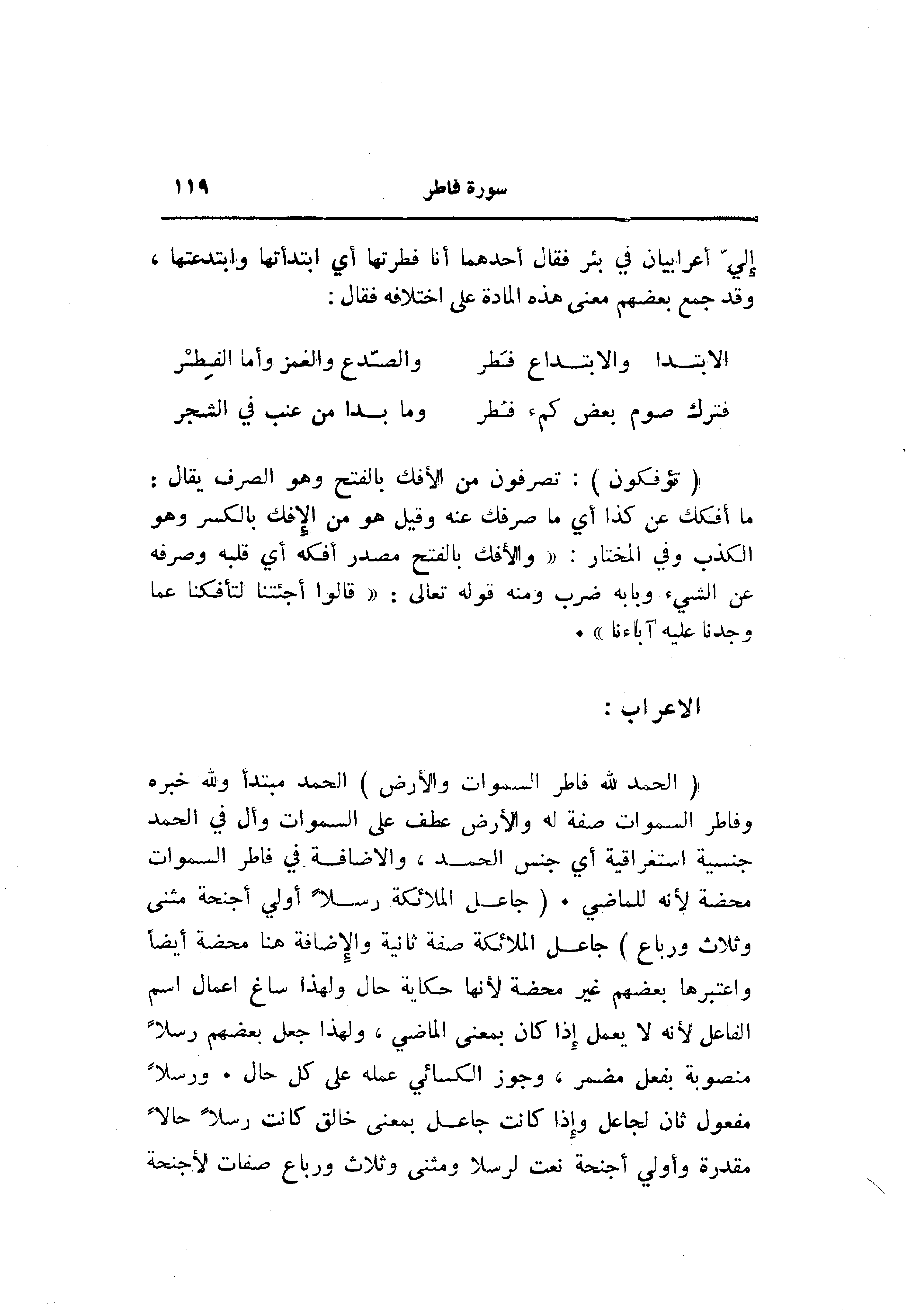 (الْحَمْدُ لِلَّهِ فاطِرِ السَّماواتِ وَالْأَرْضِ) الحمد مبتدأ ولله خبره وفاطر السموات صفة له والأرض عطف على السموات وأل في الحمد جنسية استغراقية أي جنس الحمد، والاضافة في فاطر السموات محضة لأنه للماضي. (جاعِلِ الْمَلائِكَةِ رُسُلًا أُولِي أَجْنِحَةٍ مَثْنى وَثُلاثَ وَرُباعَ) جاعل الملائكة صفة ثانية والإضافة هنا محضة أيضا واعتبرها بعضهم غير محضة لأنها حكاية حال ولهذا ساغ اعمال اسم الفاعل لأنه لا يعمل إذا كان بمعنى الماضي، ولهذا جعل بعضهم رسلا منصوبة بفعل مضمر، وجوز الكسائي عمله على كل حال. ورسلا مفعول ثان لجاعل وإذا كانت جاعل بمعنى خالق كانت رسلا حالا مقدرة وأولي أجنحة نعت لرسلا ومثنى وثلاث ورباع صفات لأجنحة