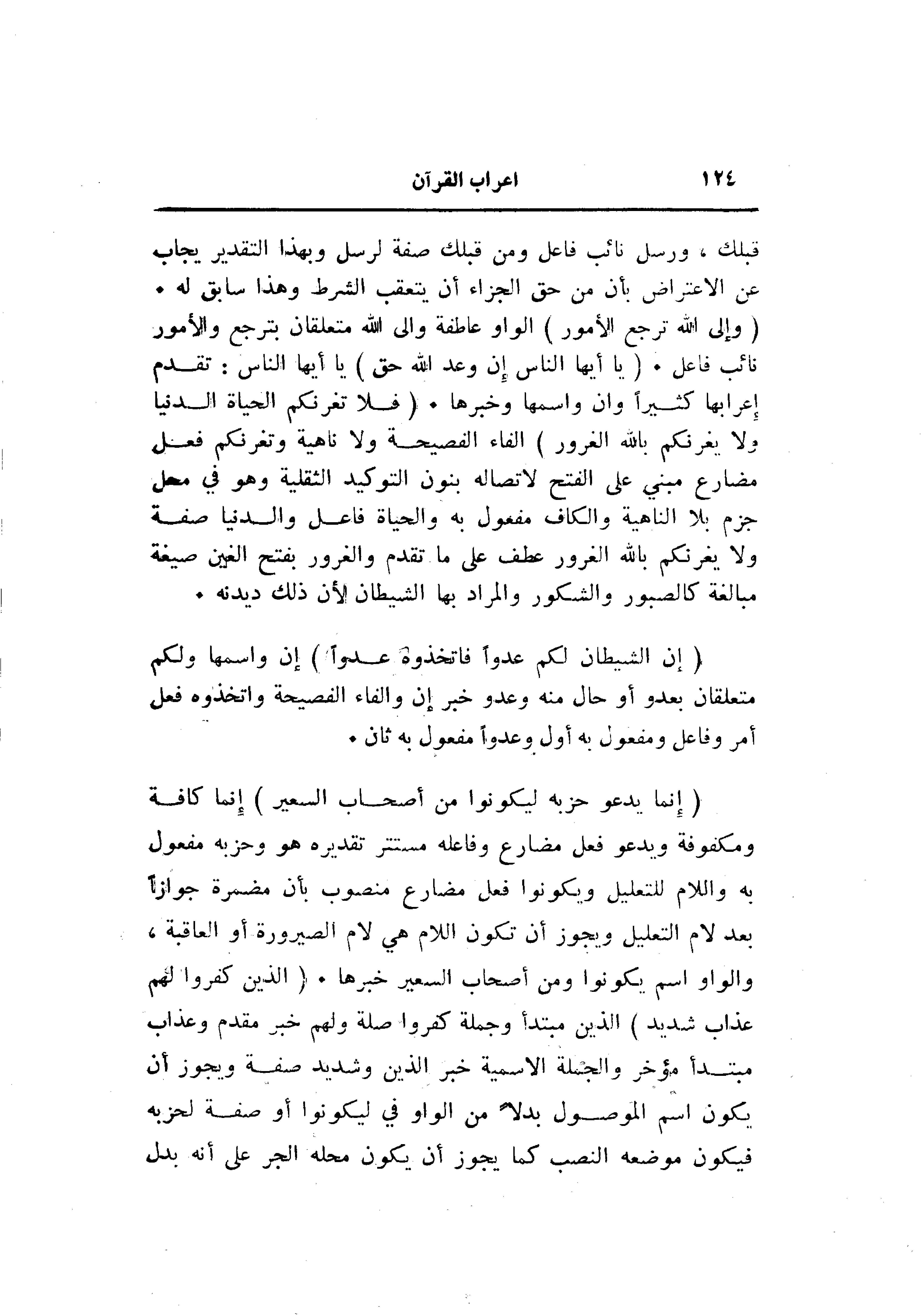 (وَإِلَى اللَّهِ تُرْجَعُ الْأُمُورُ) الواو عاطفة والى الله متعلقان بترجع والأمور نائب فاعل. (يا أَيُّهَا النَّاسُ إِنَّ وَعْدَ اللَّهِ حَقٌّ) يا أيها الناس: تقدم إعرابها كثيرا وان واسمها وخبرها. (فَلا تَغُرَّنَّكُمُ الْحَياةُ الدُّنْيا وَلا يَغُرَّنَّكُمْ بِاللَّهِ الْغَرُورُ) الفاء الفصيحة ولا ناهية وتغرنكم فعل مضارع مبني على الفتح لاتصاله بنون التوكيد الثقلية وهو في محل جزم بلا الناهية والكاف مفعول به والحياة فاعل والدنيا صفة ولا يغرنكم بالله الغرور عطف على ما تقدم والغرور بفتح الغين صيغة مبالغة كالصبور والشكور والمراد بها الشيطان لأن ذلك ديدنه.