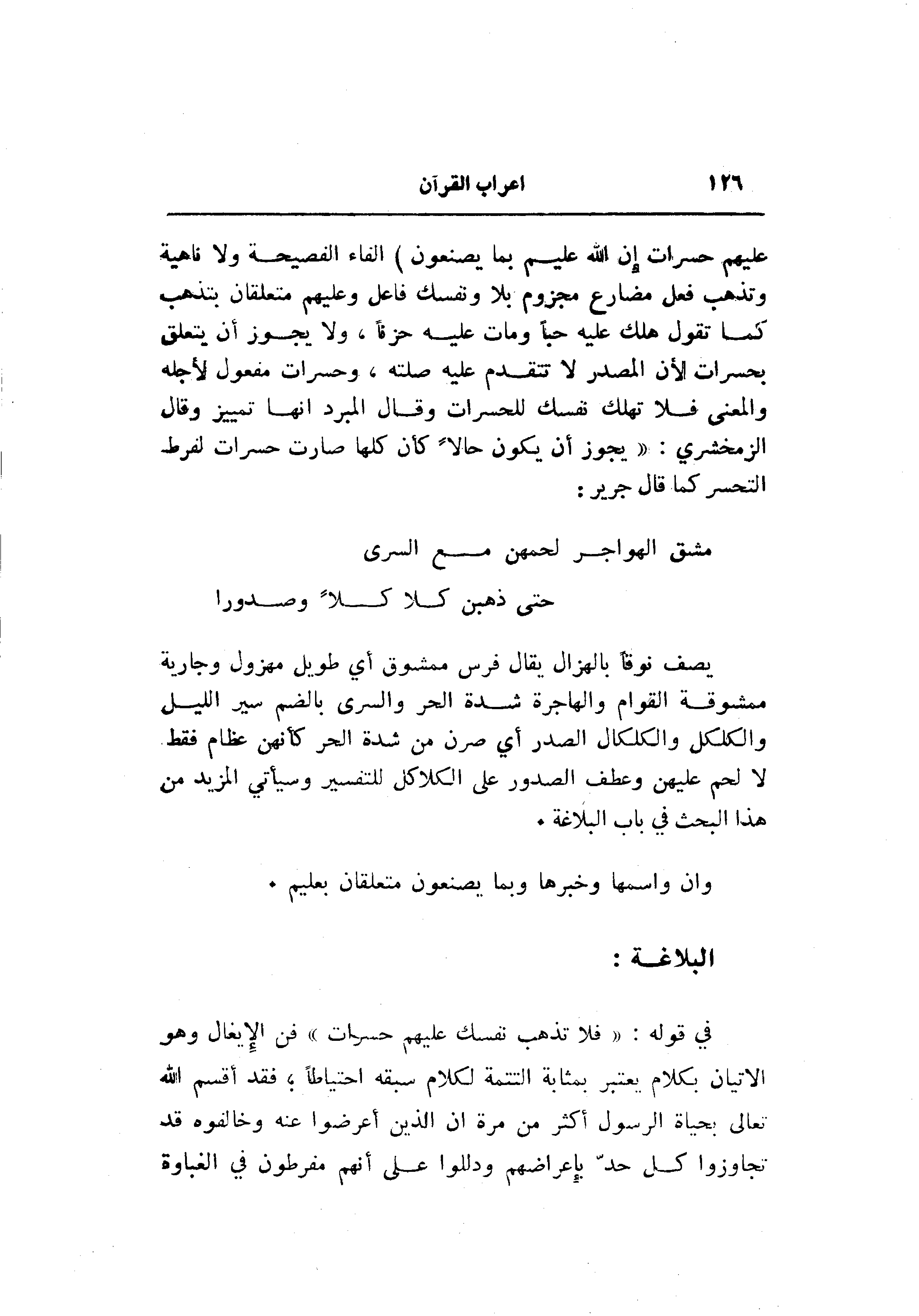 الفاء الفصيحة ولا ناهية وتذهب فعل مضارع مجزوم بلا ونفسك فاعل وعليهم متعلقان بتذهب كما تقول هلك عليه حبا ومات عليه حزنا، ولا يجوز أن يتعلق بحسرات لأن المصدر لا تتقدم عليه صلته، وحسرات مفعول لأجله والمعنى فلا تهلك نفسك للحسرات وقال المبرد انها تمييز وقال الزمخشري: «يجوز أن يكون حالا كأن كلها صارت حسرات لفرط التحسر كما قال جرير: