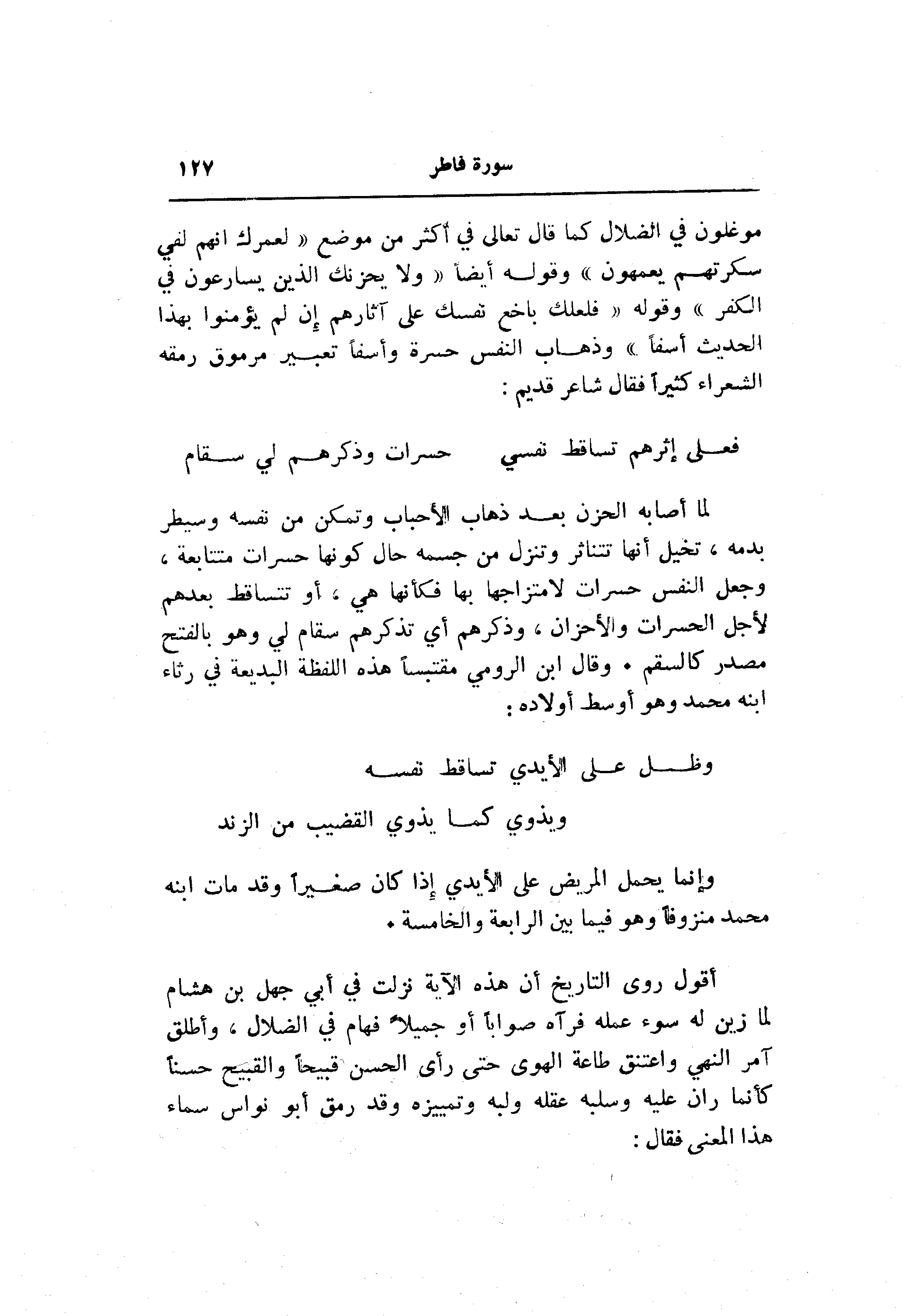 موغلون في الضلال كما قال تعالى في أكثر من موضع «لعمرك انهم لفي سكرتهم يعمهون» وقوله أيضا «ولا يحزنك الذين يسارعون في الكفر» وقوله «فلعلك باخع نفسك على آثارهم إن لم يؤمنوا بهذا الحديث أسفا» وذهاب النفس حسرة وأسفا تعبير مرموق رمقه الشعراء كثيرا فقال شاعر قديم: