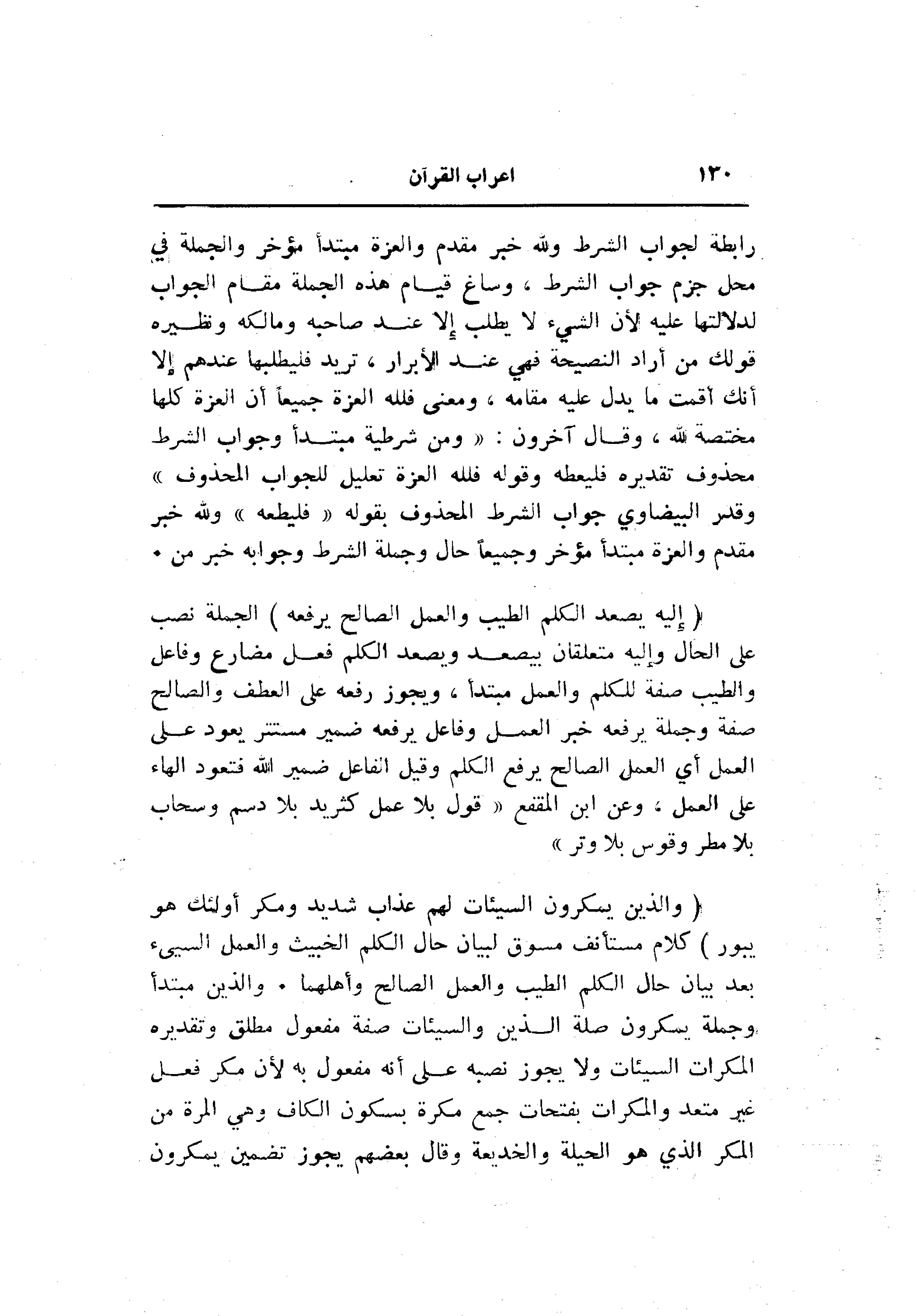(إِلَيْهِ يَصْعَدُ الْكَلِمُ الطَّيِّبُ وَالْعَمَلُ الصَّالِحُ يَرْفَعُهُ) الجملة نصب على الحال وإليه متعلقان بيصعد ويصعد الكلم فعل مضارع وفاعل والطيب صفة للكلم والعمل مبتدأ، ويجوز رفعه على العطف والصالح صفة وجملة يرفعه خبر العمل وفاعل يرفعه ضمير مستتر يعود على العمل أي العمل الصالح يرفع الكلم وقيل الفاعل ضمير الله فتعود الهاء على العمل، وعن ابن المقفع «قول بلا عمل كثريد بلا دسم وسحاب بلا مطر وقوس بلا وتر» (وَالَّذِينَ يَمْكُرُونَ السَّيِّئاتِ لَهُمْ عَذابٌ شَدِيدٌ وَمَكْرُ أُولئِكَ هُوَ يَبُورُ) كلام مستأنف مسوق لبيان حال الكلم الخبيث والعمل السيّء بعد بيان حال الكلم الطيب والعمل الصالح وأهلهما. والذين مبتدأ وجملة يمكرون صلة الذين والسيئات صفة مفعول مطلق وتقديره المكرات السيئات ولا يجوز نصبه على أنه مفعول به لأن مكر فعل غير متعد والمكرات بفتحات جمع مكرة بسكون الكاف وهي المرة من المكر الذي هو الحيلة والخديعة وقال بعضهم يجوز تضمين يمكرون