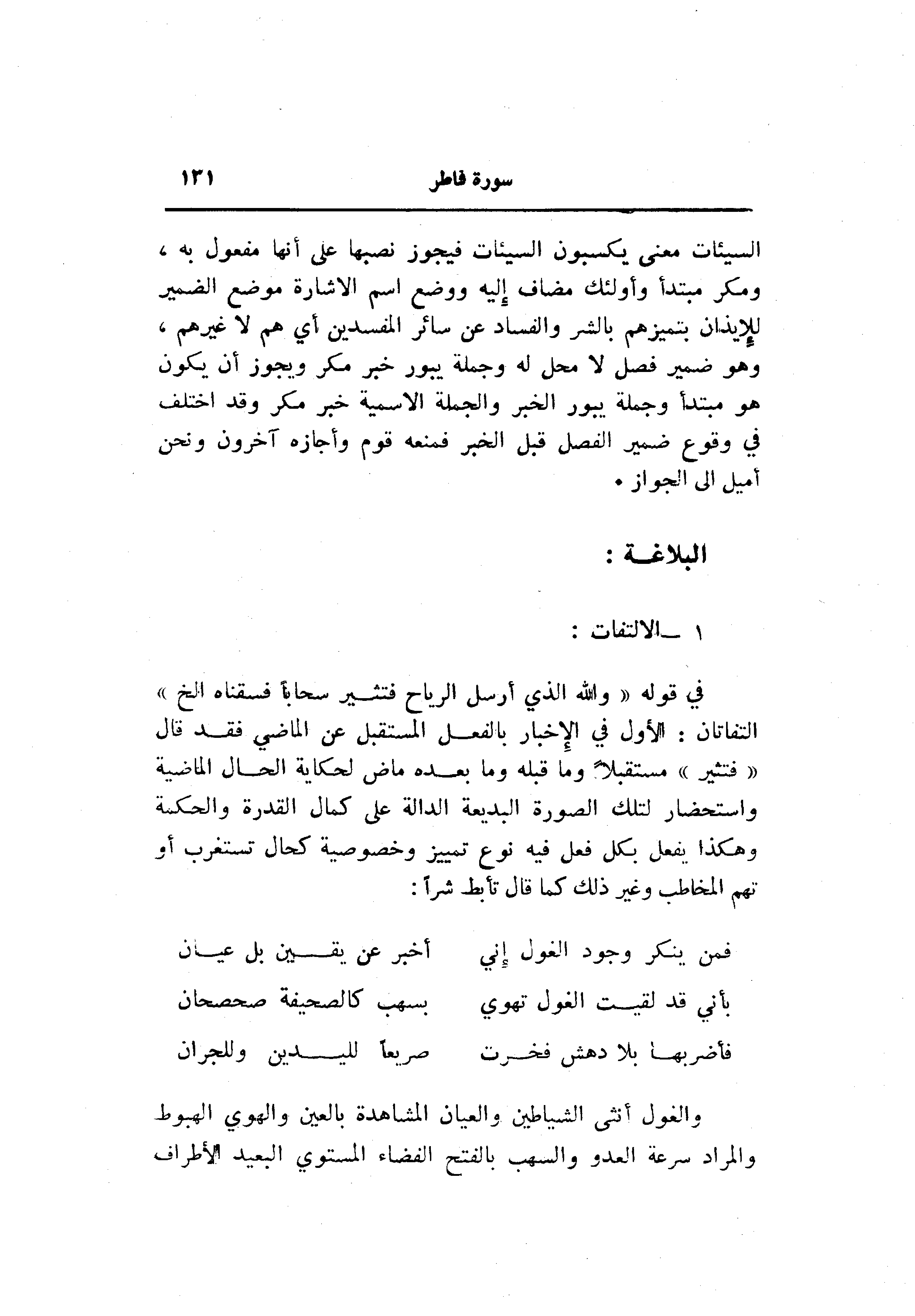 في قوله «والله الذي أرسل الرياح فتثير سحابا فسقناه إلخ» التفاتان: الأول في الإخبار بالفعل المستقبل عن الماضي فقد قال «فتثير» مستقبلا وما قبله وما بعده ماض لحكاية الحال الماضية واستحضار لتلك الصورة البديعة الدالة على كمال القدرة والحكمة وهكذا يفعل بكل فعل فيه نوع تمييز وخصوصية كحال تستغرب أو تهم المخاطب وغير ذلك كما قال تأبط شرا: