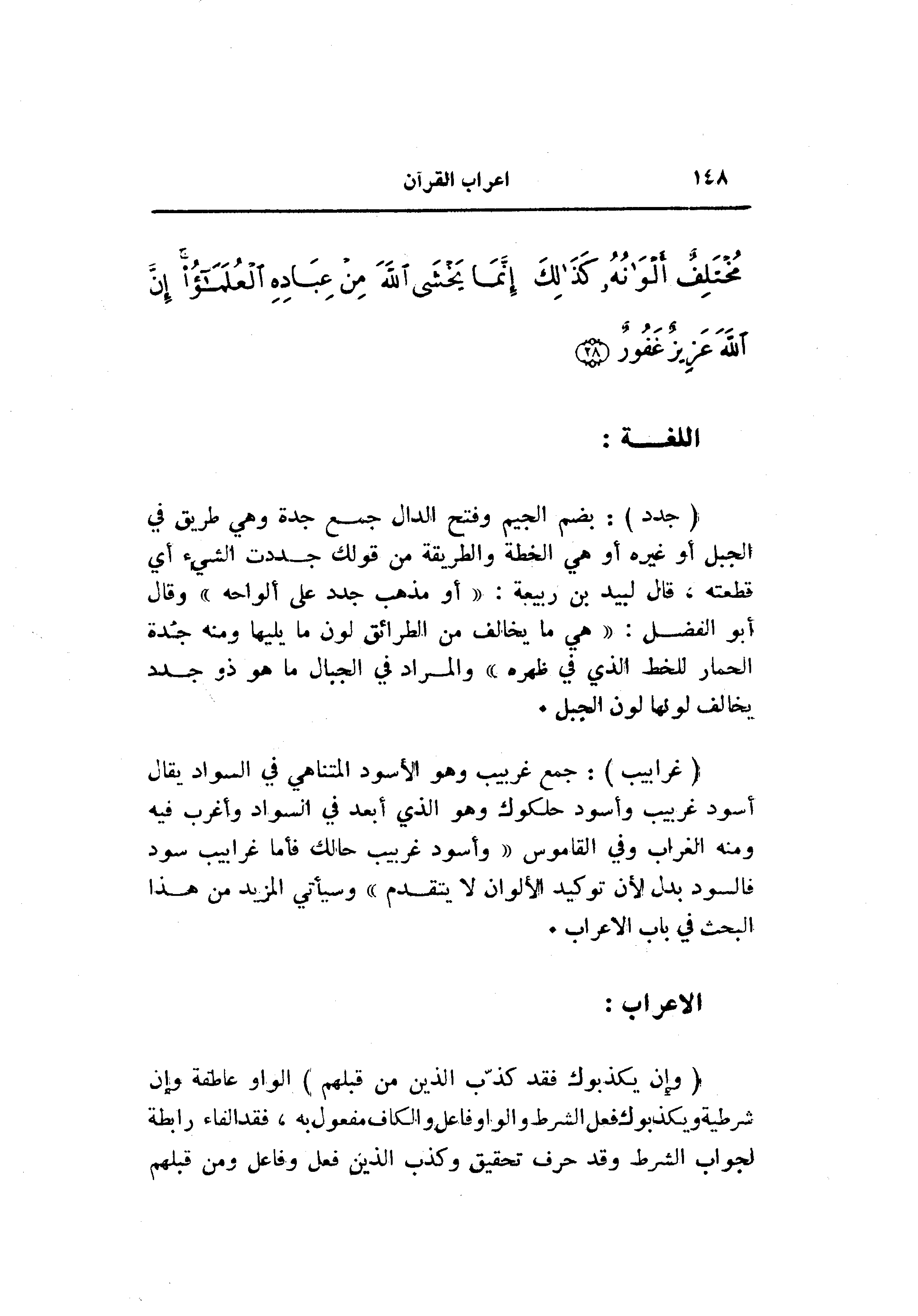 (غَرابِيبُ) : جمع غربيب وهو الأسود المتناهي في السواد يقال أسود غربيب وأسود حلكوك وهو الذي أبعد في السواد وأغرب فيه ومنه الغراب وفي القاموس «وأسود غربيب حالك فأما غرابيب سود فالسود بدل لأن توكيد الألوان لا يتقدم» وسيأتي المزيد من هذا البحث في باب الإعراب.