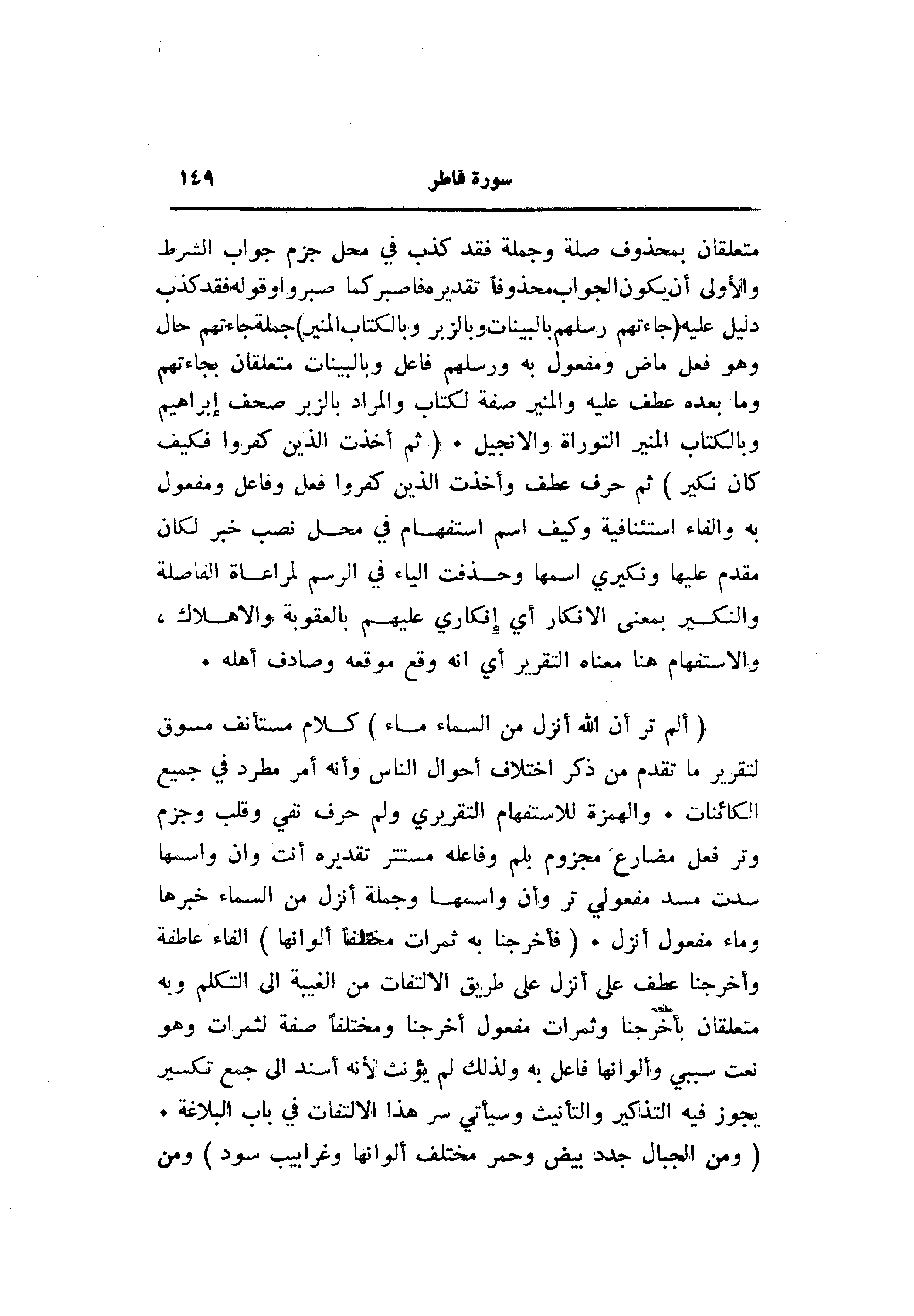 متعلقان بمحذوف صلة وجملة فقد كذب في محل جزم جواب الشرط والأولى أن يكون الجواب محذوفا تقديره فاصبر كما صبروا وقوله فقد كذب دليل عليه (جاءَتْهُمْ رُسُلُهُمْ بِالْبَيِّناتِ وَبِالزُّبُرِ وَبِالْكِتابِ الْمُنِيرِ) جملة جاءتهم حال وهو فعل ماض ومفعول به ورسلهم فاعل وبالبينات متعلقان بجاءتهم وما بعده عطف عليه والمنير صفة لكتاب والمراد بالزبر صحف إبراهيم وبالكتاب المنير التوراة والإنجيل. (ثُمَّ أَخَذْتُ الَّذِينَ كَفَرُوا فَكَيْفَ كانَ نَكِيرِ) ثم حرف عطف وأخذت الذين كفروا فعل وفاعل ومفعول به والفاء استئنافية وكيف اسم استفهام في محل نصب خبر لكان مقدم عليها ونكيري اسمها وحذفت الياء في الرسم لمراعاة الفاصلة والنكير بمعنى الإنكار أي إنكاري عليهم بالعقوبة والإهلاك، والاستفهام هنا معناه التقرير أي انه وقع موقعه وصادف أهله.