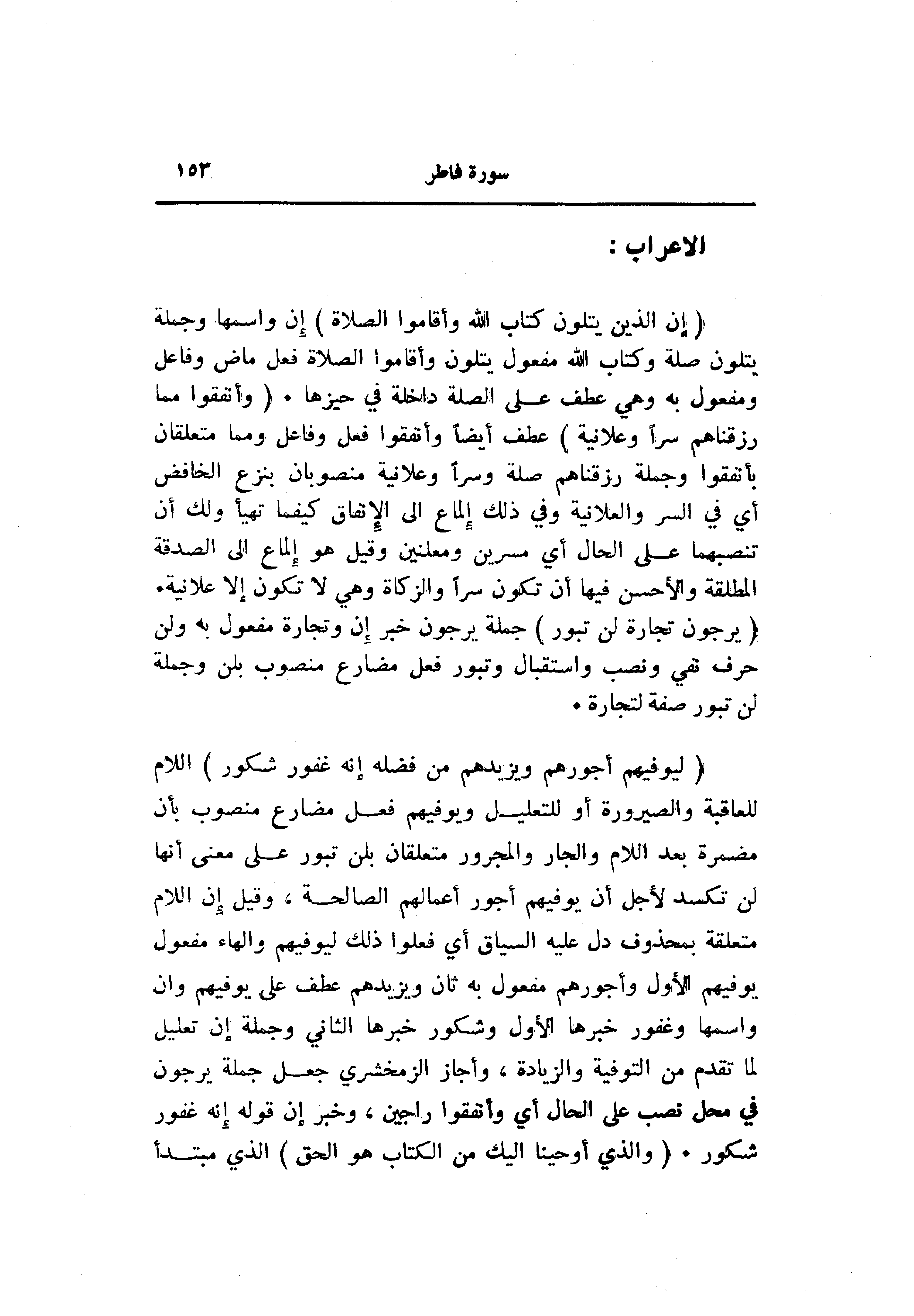 (إِنَّ الَّذِينَ يَتْلُونَ كِتابَ اللَّهِ وَأَقامُوا الصَّلاةَ) إن واسمها وجملة يتلون صلة وكتاب الله مفعول يتلون وأقاموا الصلاة فعل ماض وفاعل ومفعول به وهي عطف على الصلة داخلة في حيزها. (وَأَنْفَقُوا مِمَّا رَزَقْناهُمْ سِرًّا وَعَلانِيَةً) عطف أيضا وأنفقوا فعل وفاعل ومما متعلقان بأنفقوا وجملة رزقناهم صلة وسرا وعلانية منصوبان بنزع الخافض أي في السر والعلانية وفي ذلك إلماع الى الإنفاق كيفما تهيأ ولك أن تنصبهما على الحال أي مسرين ومعلنين وقيل هو إلماع الى الصدقة المطلقة والأحسن فيها أن تكون سرا والزكاة وهي لا تكون إلا علانية.