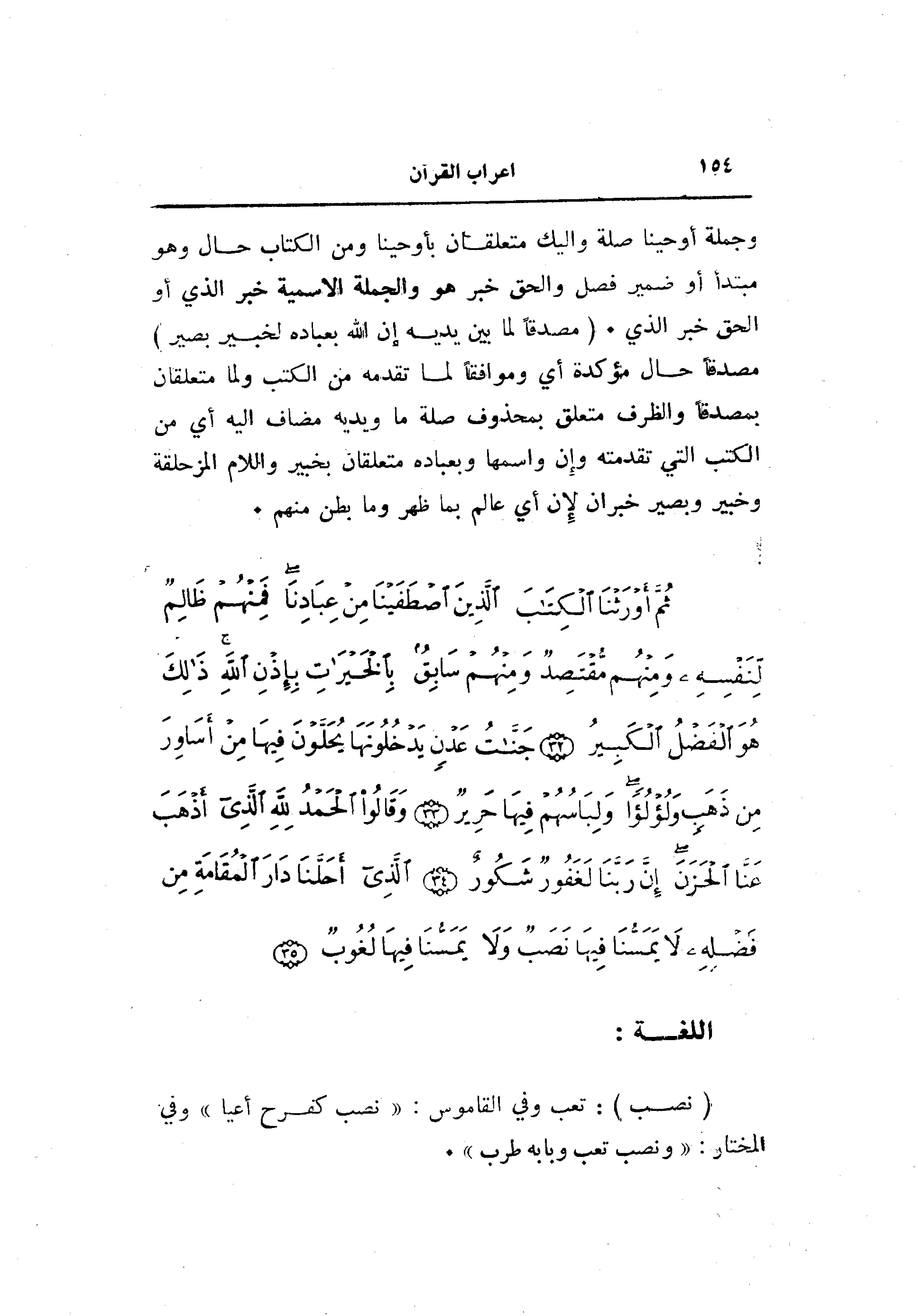 وجملة أوحينا صلة وإليك متعلقان بأوحينا ومن الكتاب حال وهو مبتدأ أو ضمير فصل والحق خبر هو والجملة الاسمية خبر الذي أو الحق خبر الذي. (مُصَدِّقاً لِما بَيْنَ يَدَيْهِ إِنَّ اللَّهَ بِعِبادِهِ لَخَبِيرٌ بَصِيرٌ) مصدقا حال مؤكدة أي وموافقا لما تقدمه من الكتب ولما متعلقان بمصدقا والظرف متعلق بمحذوف صلة ما ويديه مضاف اليه أي من الكتب التي تقدمته وإن واسمها وبعباده متعلقان بخبير واللام المزحلقة وخبير وبصير خبران لإن أي عالم بما ظهر وما بطن منهم.