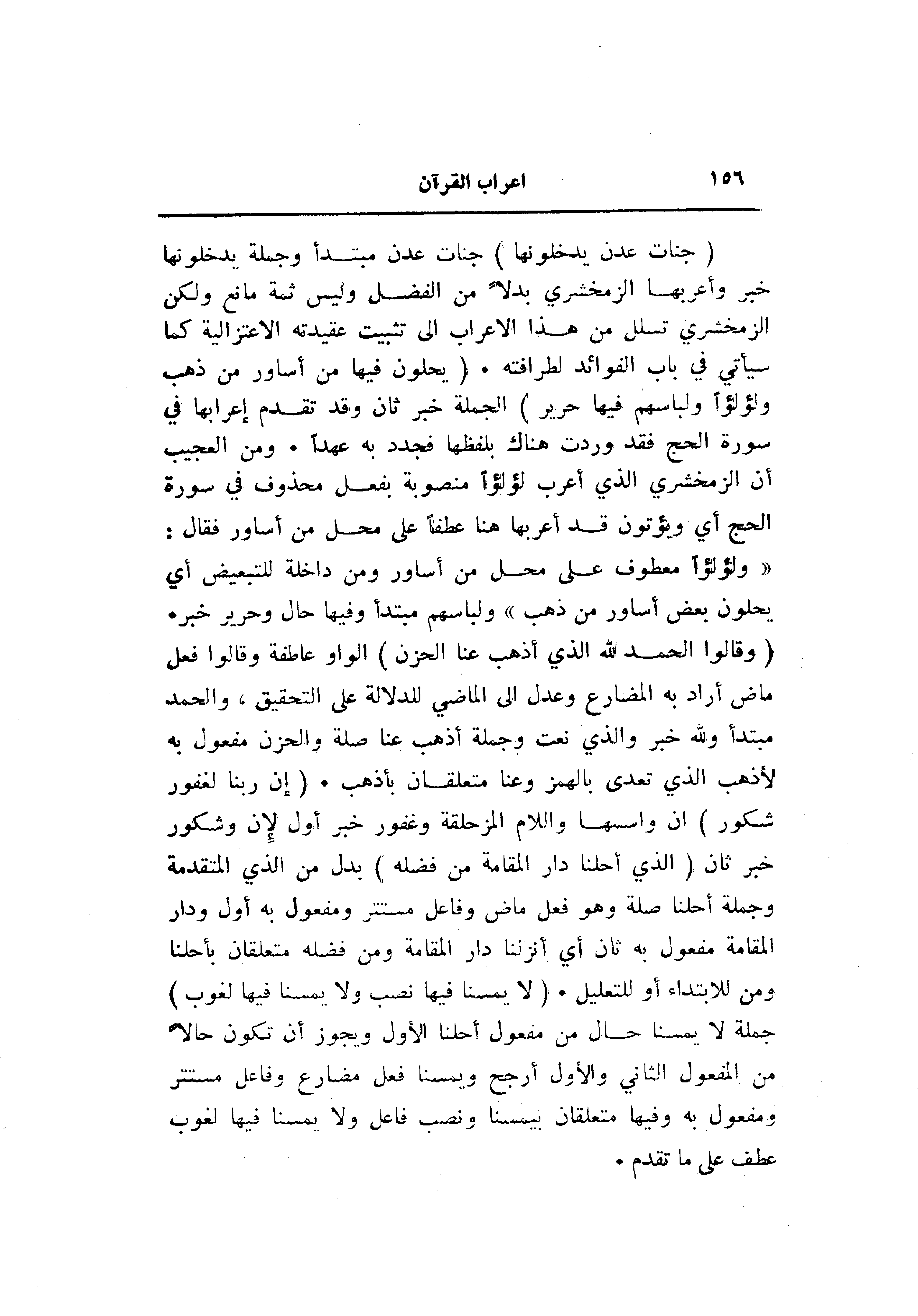 (جَنَّاتُ عَدْنٍ يَدْخُلُونَها) جنات عدن مبتدأ وجملة يدخلونها خبر وأعربها الزمخشري بدلا من الفضل وليس ثمة مانع ولكن الزمخشري تسلل من هذا الإعراب الى تثبيت عقيدته الاعتزالية كما سيأتي في باب الفوائد لطرافته. (يُحَلَّوْنَ فِيها مِنْ أَساوِرَ مِنْ ذَهَبٍ وَلُؤْلُؤاً وَلِباسُهُمْ فِيها حَرِيرٌ) الجملة خبر ثان وقد تقدم إعرابها في سورة الحج فقد وردت هناك بلفظها فجدد به عهدا. ومن العجيب أن الزمخشري الذي أعرب لؤلؤا منصوبة بفعل محذوف في سورة الحج أي ويؤتون قد أعربها هنا عطفا على محل من أساور فقال: