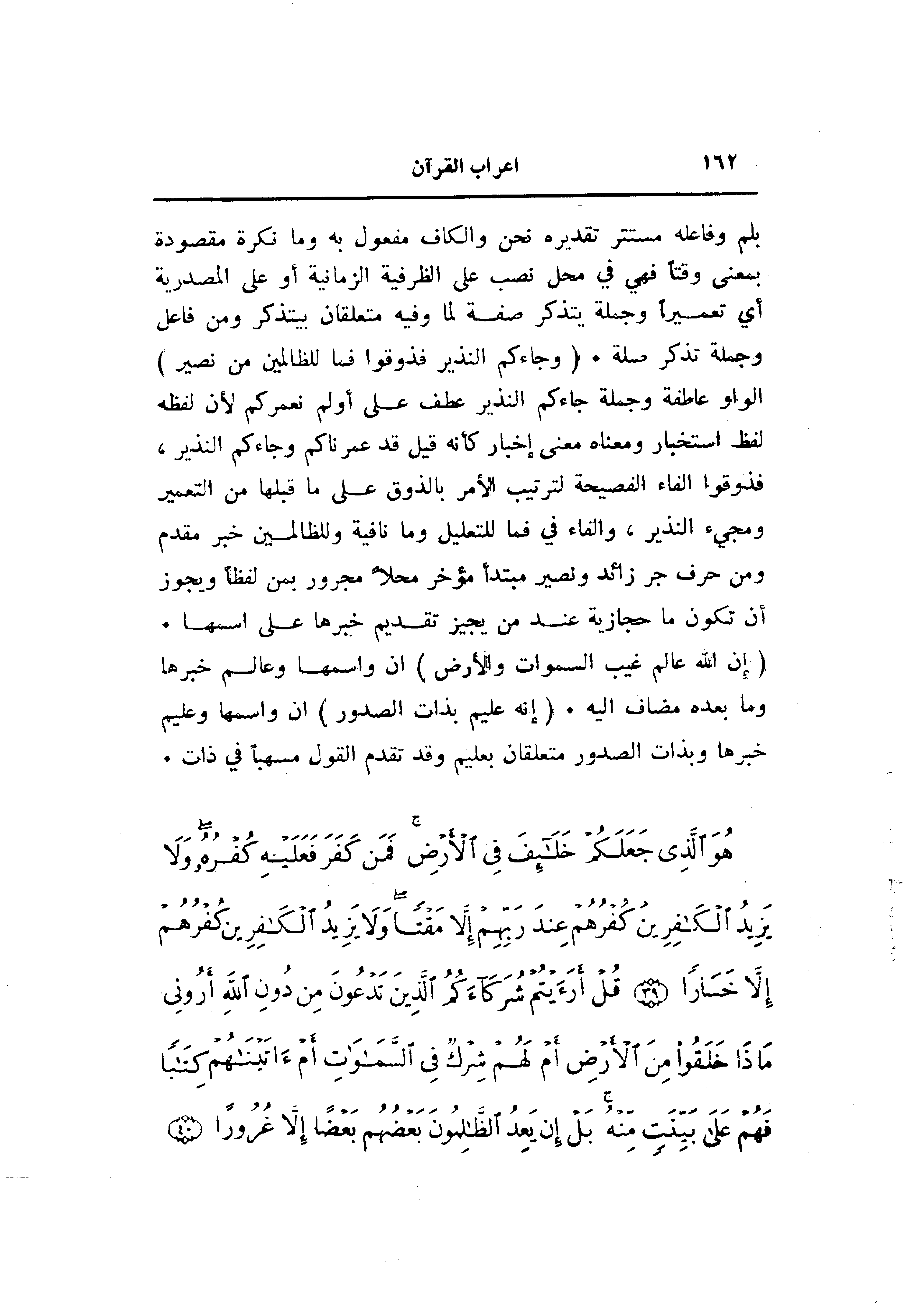 بلم وفاعله مستتر تقديره نحن والكاف مفعول به وما نكرة مقصودة بمعنى وقتا فهي في محل نصب على الظرفية الزمانية أو على المصدرية أي تعميرا وجملة يتذكر صفة لما وفيه متعلقان بيتذكر ومن فاعل وجملة تذكر صلة. (وَجاءَكُمُ النَّذِيرُ فَذُوقُوا فَما لِلظَّالِمِينَ مِنْ نَصِيرٍ) الواو عاطفة وجملة جاءكم النذير عطف على أولم نعمركم لأن لفظه لفظ استخبار ومعناه معنى إخبار كأنه قيل قد عمرناكم وجاءكم النذير، فذوقوا الفاء الفصيحة لترتيب الأمر بالذوق على ما قبلها من التعمير ومجيء النذير، والفاء في فما للتعليل وما نافية وللظالمين خبر مقدم ومن حرف جر زائد ونصير مبتدأ مؤخر محلا مجرور بمن لفظا ويجوز أن تكون ما حجازية عند من يجيز تقديم خبرها على اسمها.
