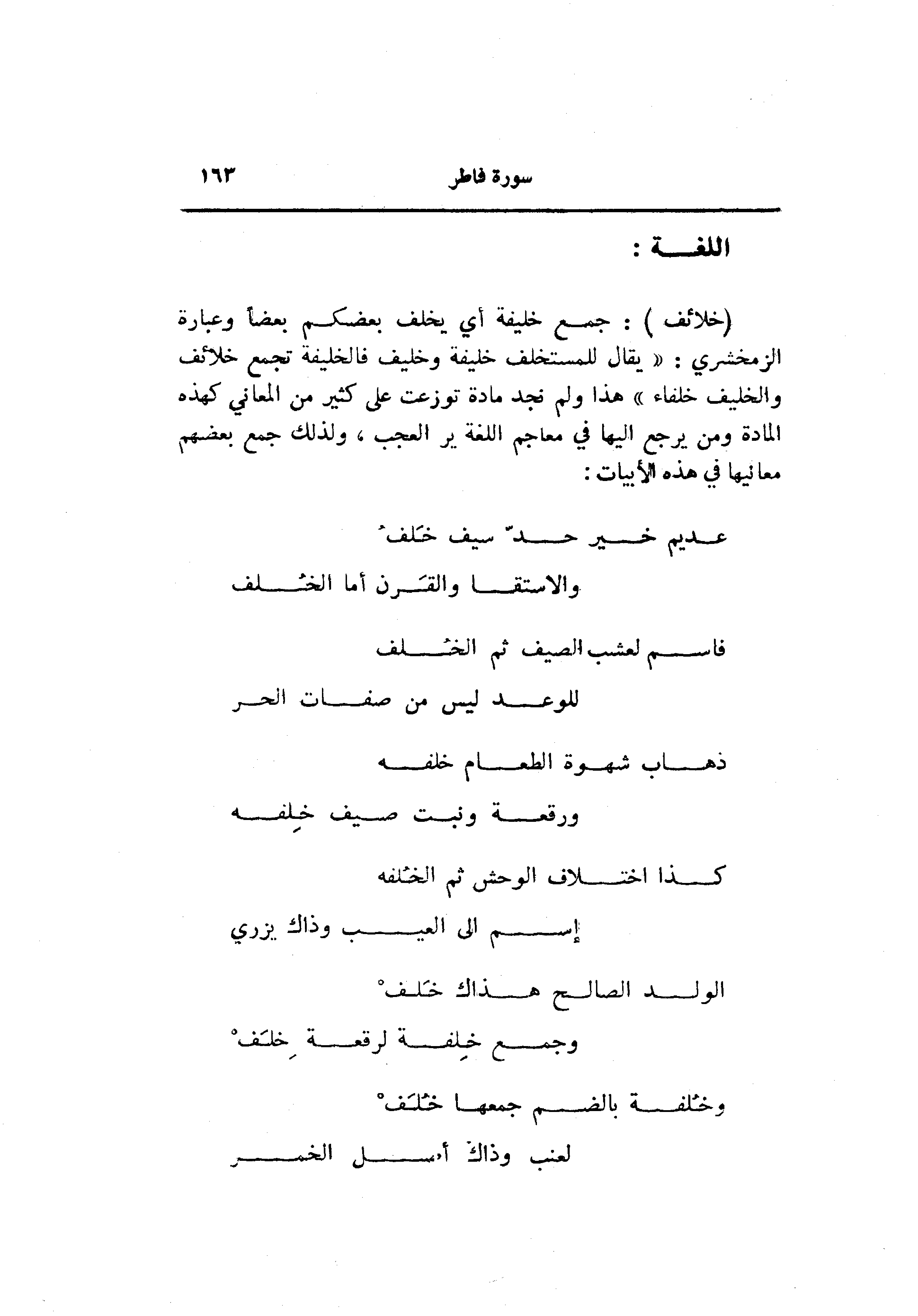 (خَلائِفَ) : جمع خليفة أي يخلف بعضكم بعضا وعبارة الزمخشري: «يقال للمستخلف خليفة وخليف فالخليفة تجمع خلائف والخليف خلفاء» هذا ولم نجد مادة توزعت على كثير من المعاني كهذه المادة ومن يرجع إليها في معاجم اللغة ير العجب، ولذلك جمع بعضهم معانيها في هذه الأبيات: