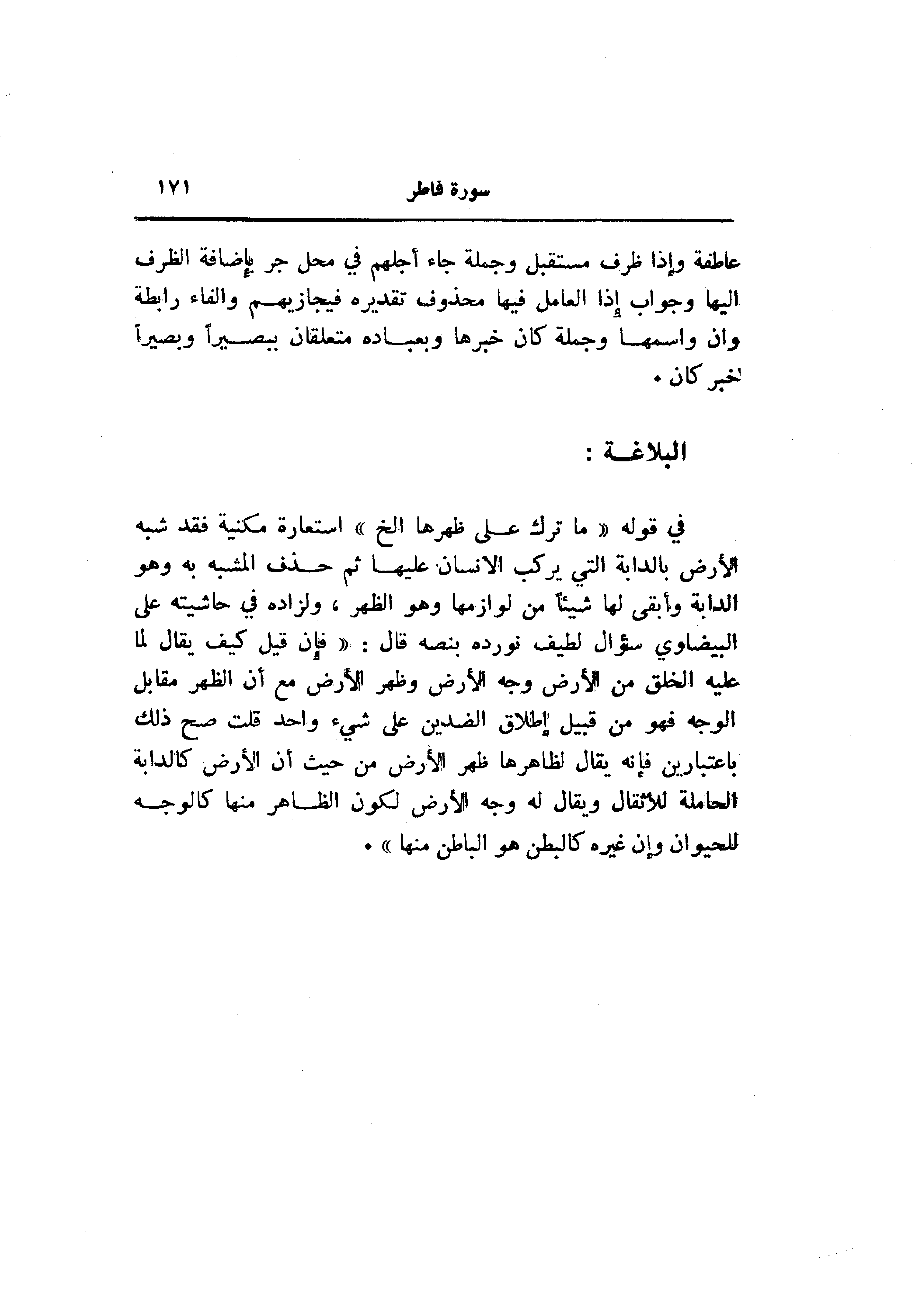 في قوله «ما ترك على ظهرها إلخ» استعارة مكنية فقد شبه الأرض بالدابة التي يركب الإنسان عليها ثم حذف المشبه به وهو الدابة وأبقى لها شيئا من لوازمها وهو الظهر، ولزاده في حاشيته على البيضاوي سؤال لطيف نورده بنصه قال: «فإن قيل كيف يقال لما عليه الخلق من الأرض وجه الأرض وظهر الأرض مع أن الظهر مقابل الوجه فهو من قبيل إطلاق الضدين على شيء واحد قلت صح ذلك باعتبارين فإنه يقال لظاهرها ظهر الأرض من حيث أن الأرض كالدابة الحاملة للأثقال ويقال له وجه الأرض لكون الظاهر منها كالوجه للحيوان وإن غيره كالبطن هو الباطن منها» .
