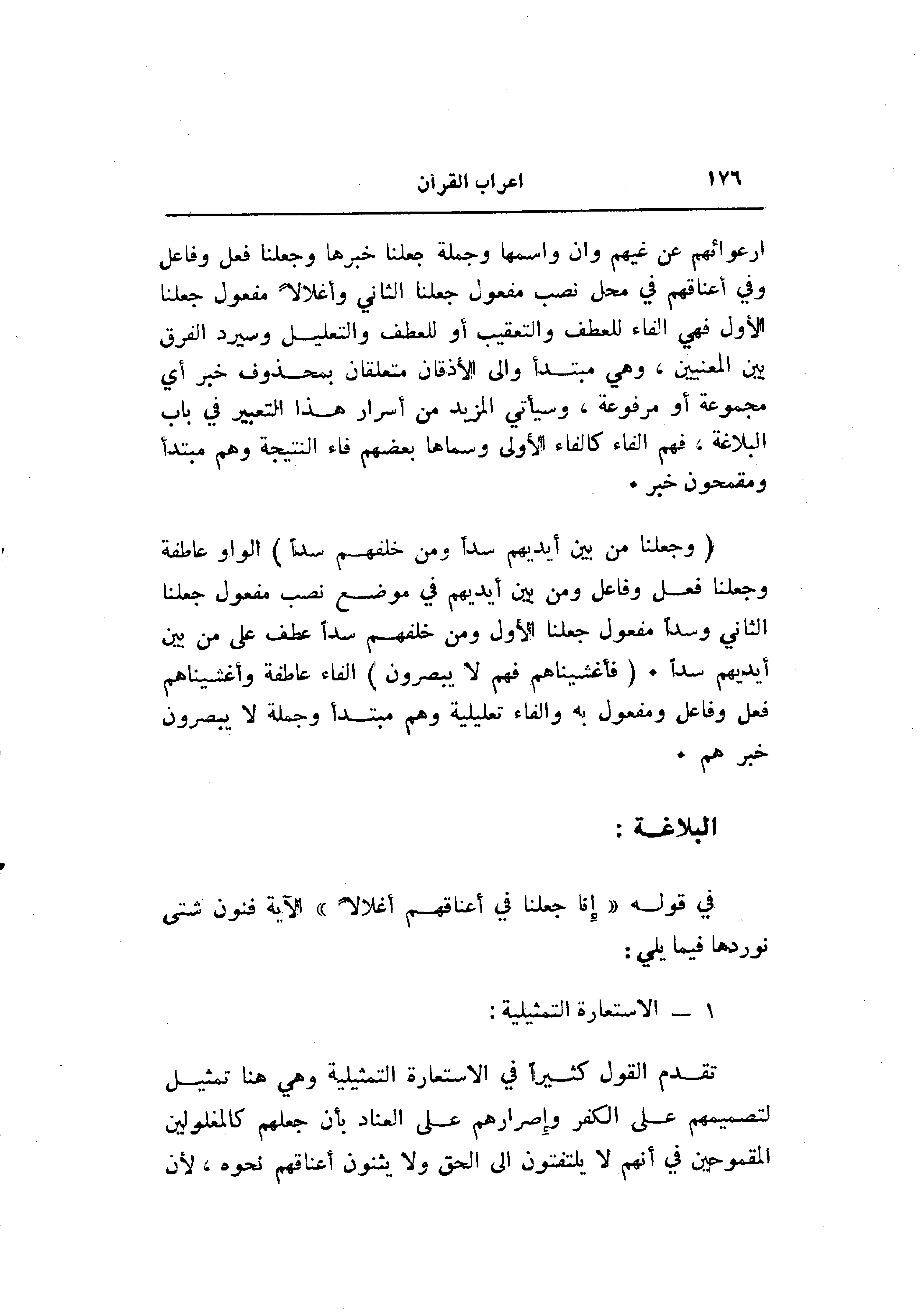 ارعوائهم عن غيهم وان واسمها وجملة جعلنا خبرها وجعلنا فعل وفاعل وفي أعناقهم في محل نصب مفعول جعلنا الثاني وأغلالا مفعول جعلنا الأول فهي الفاء للعطف والتعقيب أو للعطف والتعليل وسيرد الفرق بين المعنيين، وهي مبتدأ والى الأذقان متعلقان بمحذوف خبر أي مجموعة أو مرفوعة، وسيأتي المزيد من أسرار هذا التعبير في باب البلاغة، فهم الفاء كالفاء الأولى وسماها بعضهم فاء النتيجة وهم مبتدأ ومقمحون خبر.