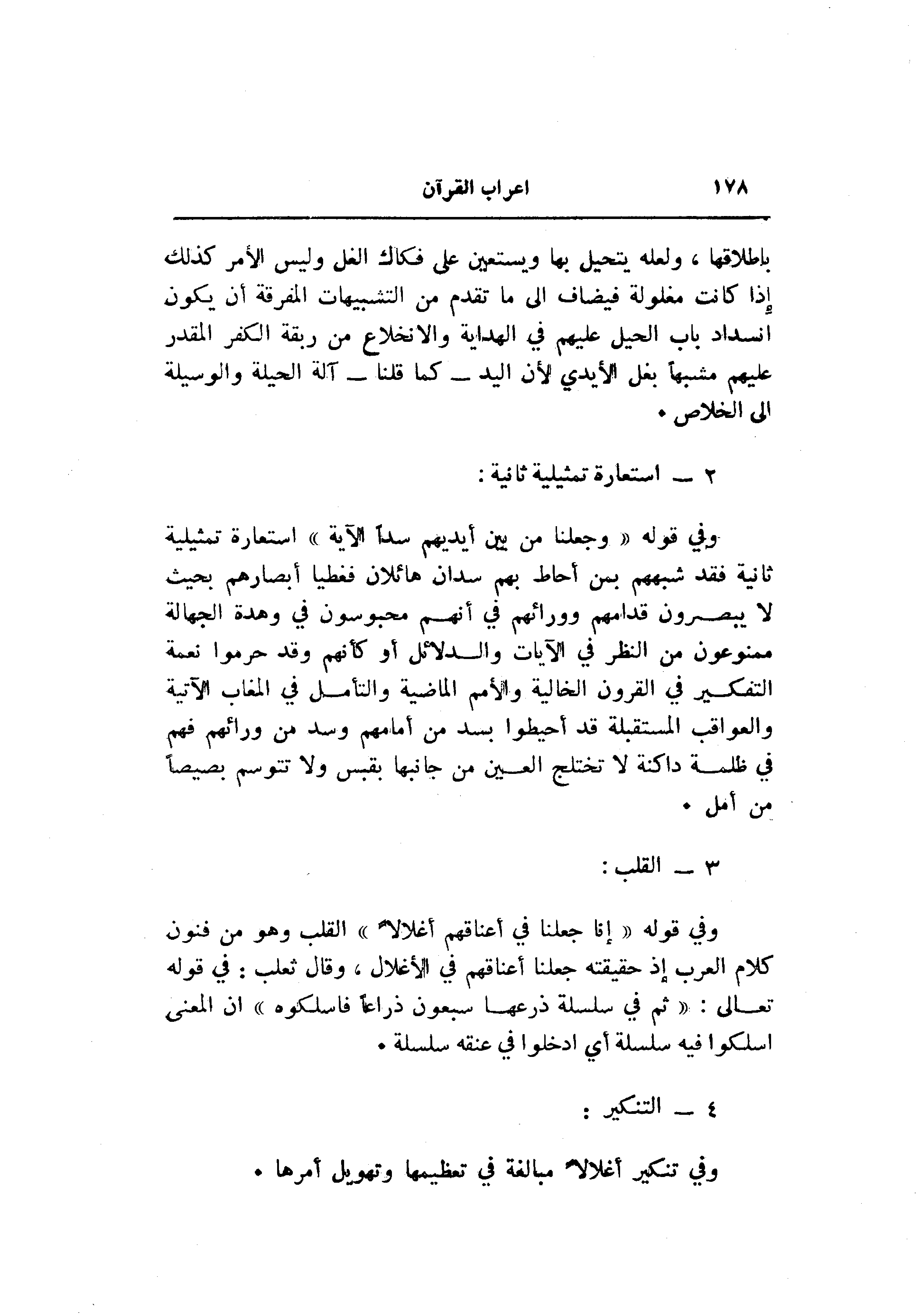 وفي قوله «إنا جعلنا في أعناقهم أغلالا» القلب وهو من فنون كلام العرب إذ حقيقته جعلنا أعناقهم في الأغلال، وقال ثعلب: في قوله تعالى: «ثم في سلسلة ذرعها سبعون ذراعا فاسلكوه» ان المعنى اسلكوا فيه سلسلة أي ادخلوا في عنقه سلسلة.