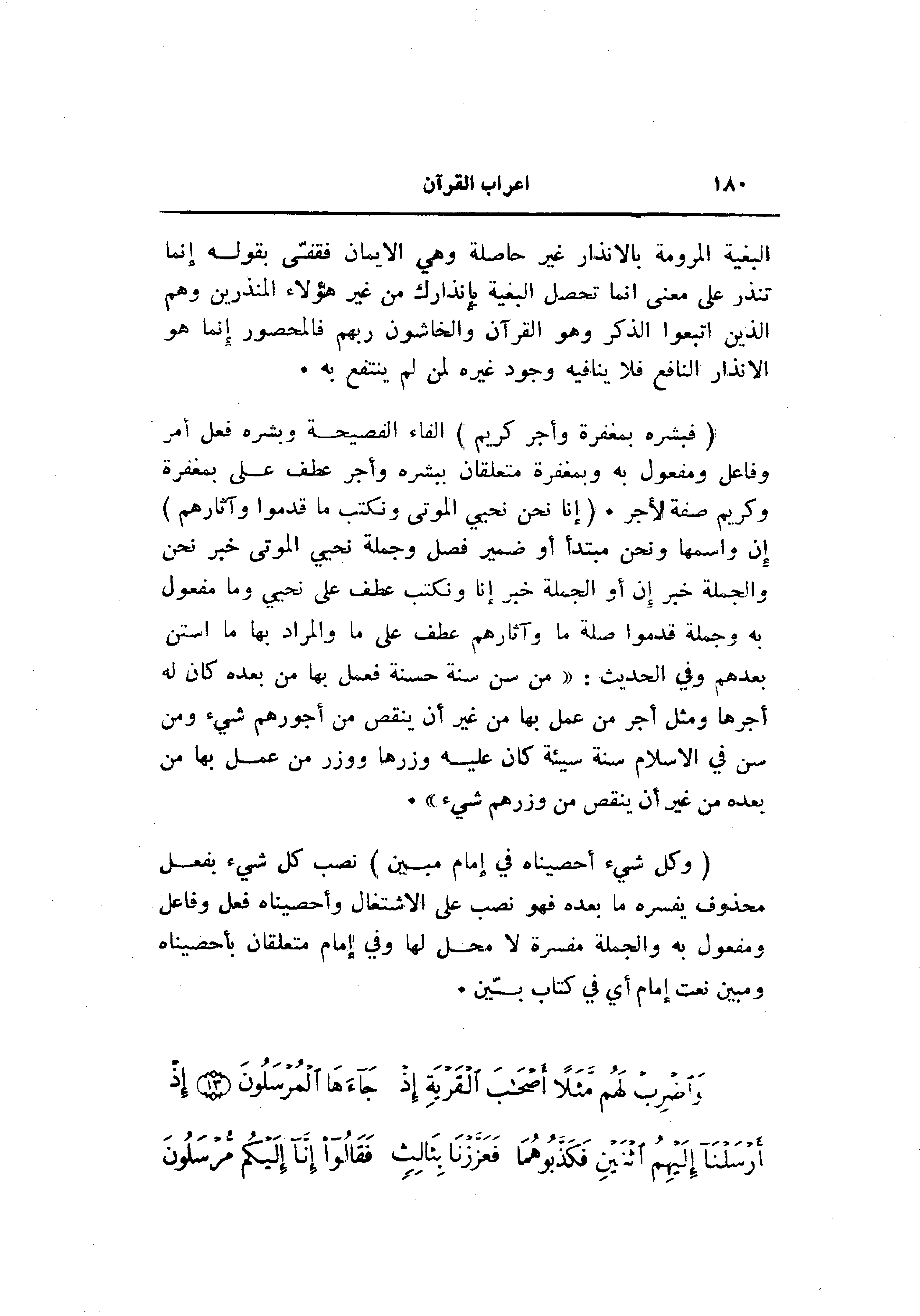 (فَبَشِّرْهُ بِمَغْفِرَةٍ وَأَجْرٍ كَرِيمٍ) الفاء الفصيحة وبشره فعل أمر وفاعل ومفعول به وبمغفرة متعلقان ببشره وأجر عطف على بمغفرة وكريم صفة لأجر. (إِنَّا نَحْنُ نُحْيِ الْمَوْتى وَنَكْتُبُ ما قَدَّمُوا وَآثارَهُمْ) إن واسمها ونحن مبتدأ أو ضمير فصل وجملة نحيي الموتى خبر نحن والجملة خبر إن أو الجملة خبر إنا ونكتب عطف على نحيي وما مفعول به وجملة قدموا صلة ما وآثارهم عطف على ما والمراد بها ما استن بعدهم وفي الحديث: «من سن سنة حسنة فعمل بها من بعده كان له أجرها ومثل أجر من عمل بها من غير أن ينقص من أجورهم شيء ومن سن في الإسلام سنة سيئة كان عليه وزرها ووزر من عمل بها من بعده من غير أن ينقص من وزرهم شيء» .