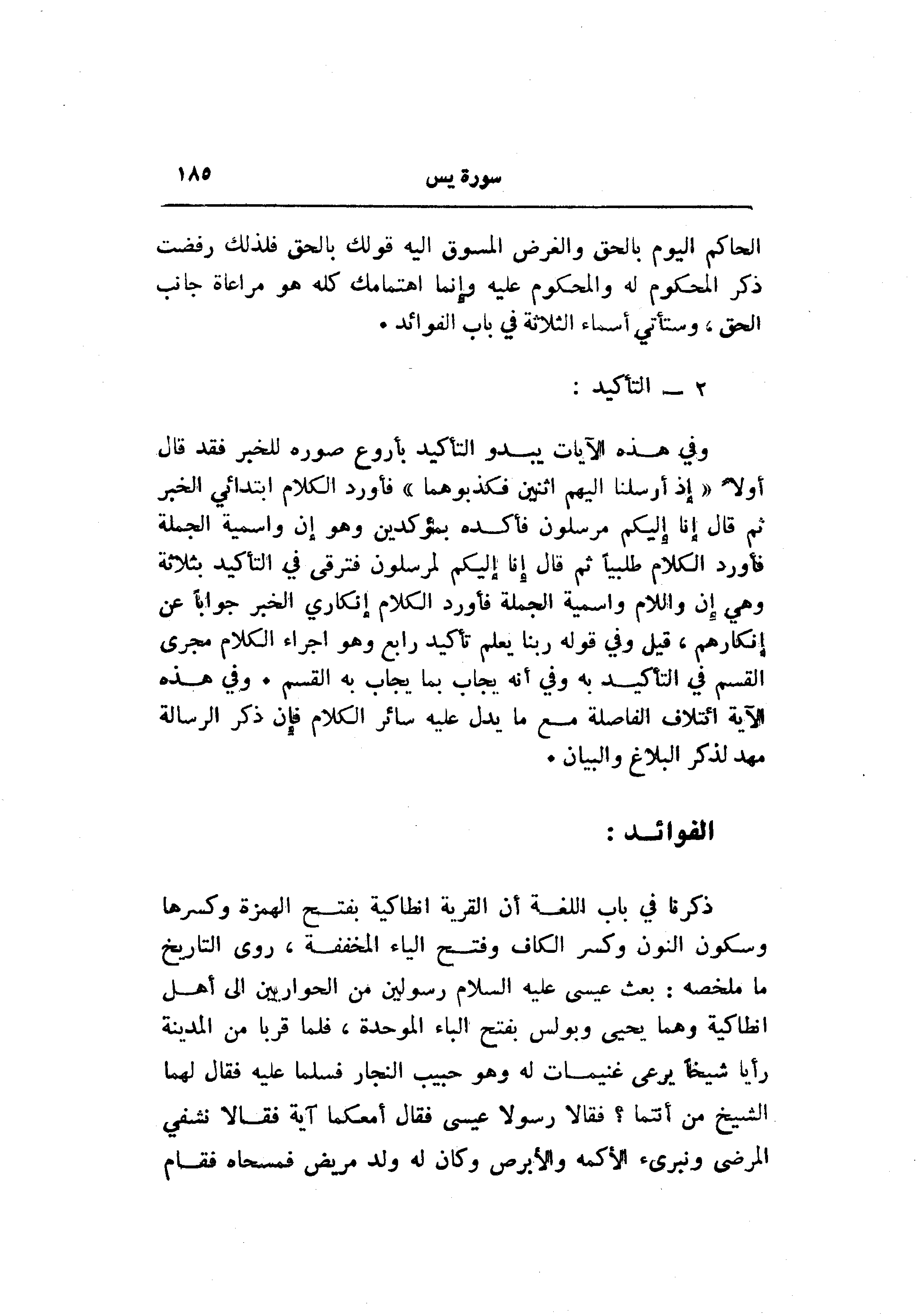وفي هذه الآيات يبدو التأكيد بأروع صوره للخبر فقد قال أولا «إذ أرسلنا إليهم اثنين فكذبوهما» فأورد الكلام ابتدائي الخبر ثم قال إنا إليكم مرسلون فأكده بمؤكدين وهو إن واسمية الجملة فأورد الكلام طلبيا ثم قال إنا إليكم لمرسلون فترقى في التأكيد بثلاثة وهي إن واللام واسمية الجملة فأورد الكلام إنكاري الخبر جوابا عن إنكارهم، قيل وفي قوله ربنا يعلم تأكيد رابع وهو اجراء الكلام مجرى القسم في التأكيد به وفي أنه يجاب بما يجاب به القسم. وفي هذه الآية ائتلاف الفاصلة مع ما يدل عليه سائر الكلام فإن ذكر الرسالة مهد لذكر البلاغ والبيان.
