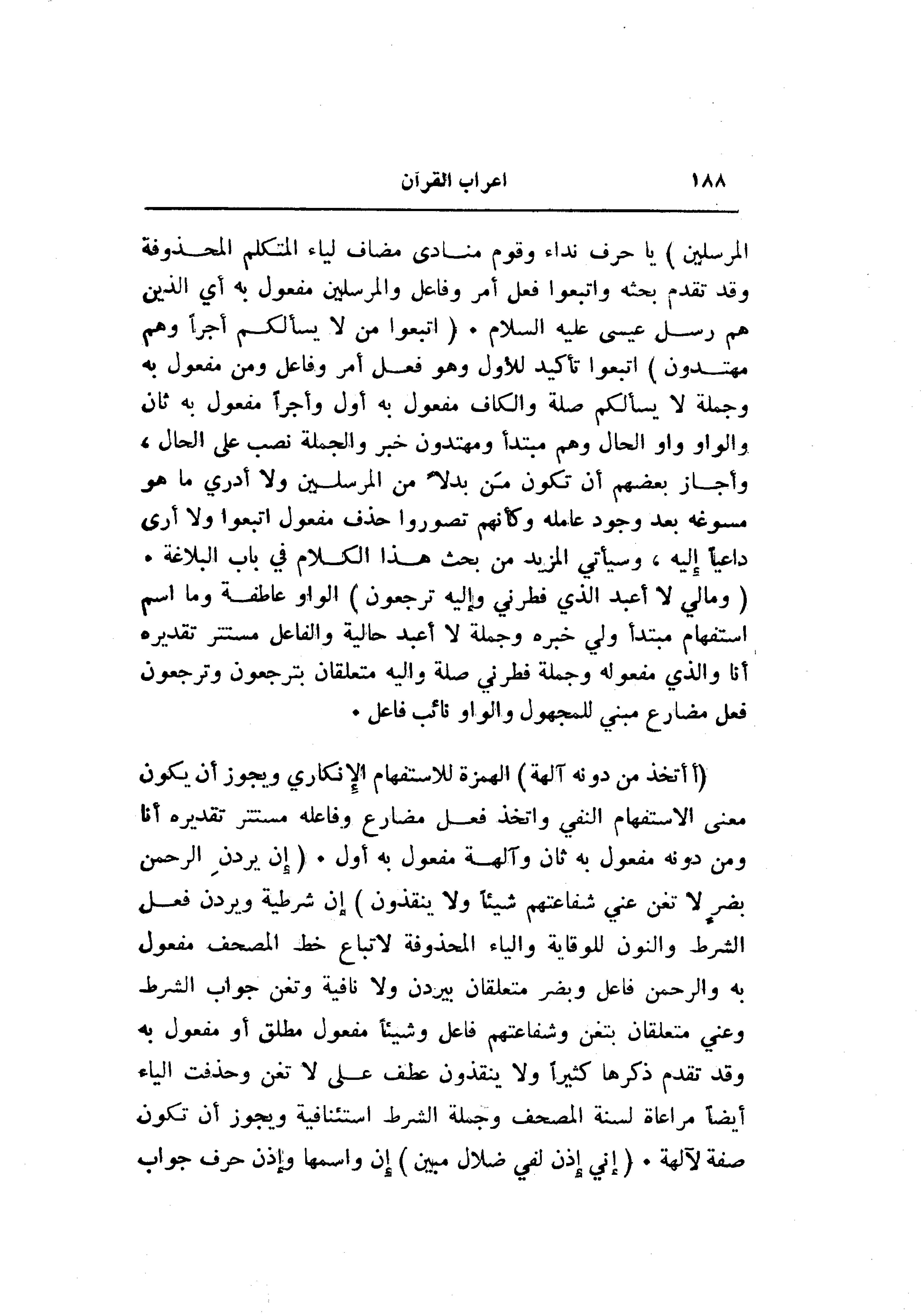 يا حرف نداء وقوم منادى مضاف لياء المتكلم المحذوفة وقد تقدم بحثه واتبعوا فعل أمر وفاعل والمرسلين مفعول به أي الذين هم رسل عيسى عليه السلام. (اتَّبِعُوا مَنْ لا يَسْئَلُكُمْ أَجْراً وَهُمْ مُهْتَدُونَ) اتبعوا تأكيد للأول وهو فعل أمر وفاعل ومن مفعول به وجملة لا يسألكم صلة والكاف مفعول به أول وأجرا مفعول به ثان والواو واو الحال وهم مبتدأ ومهتدون خبر والجملة نصب على الحال، وأجاز بعضهم أن تكون من بدلا من المرسلين ولا أدري ما هو مسوغه بعد وجود عامله وكأنهم تصوروا حذف مفعول اتبعوا ولا أرى داعيا إليه، وسيأتي المزيد من بحث هذا الكلام في باب البلاغة.