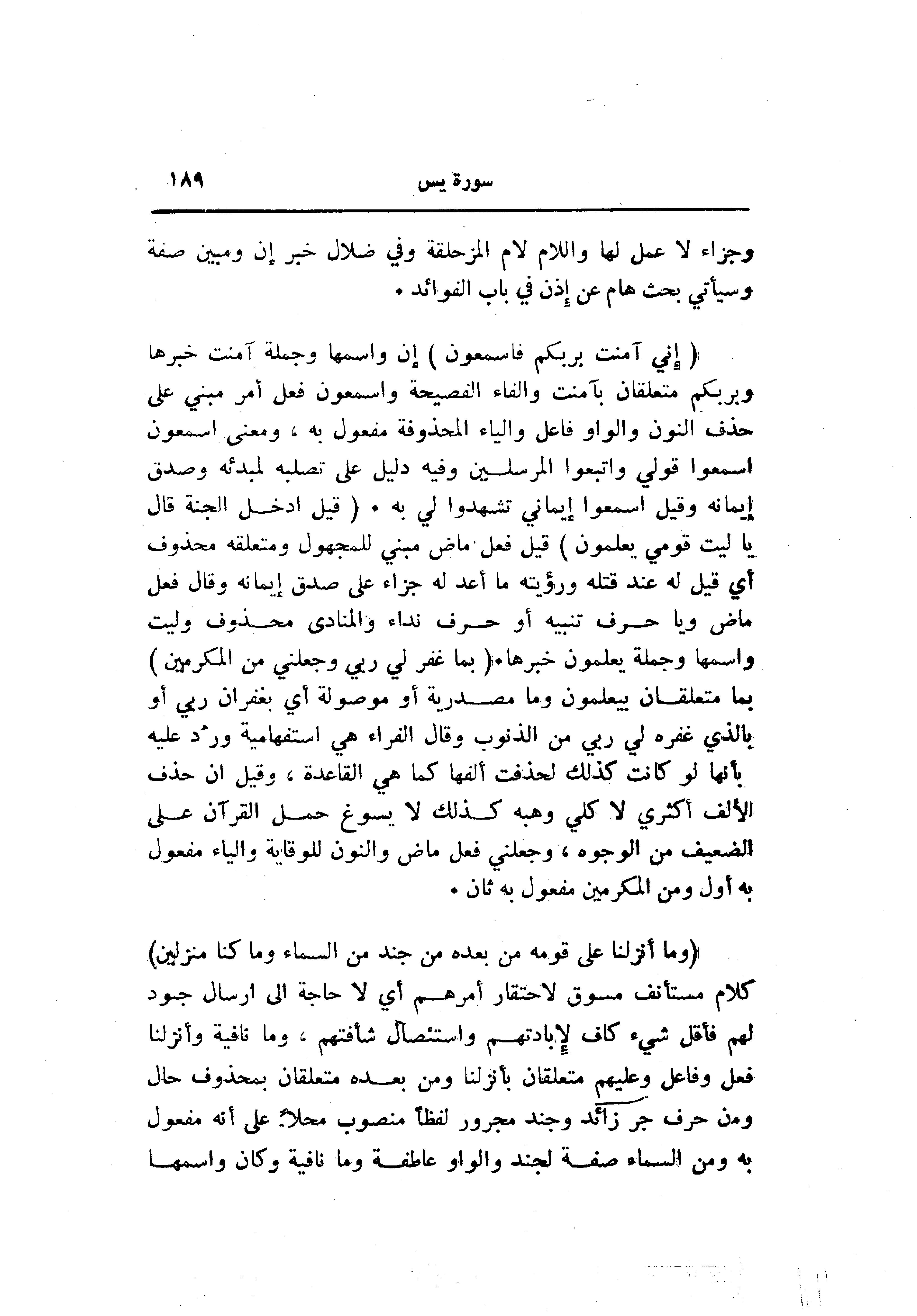 (إِنِّي آمَنْتُ بِرَبِّكُمْ فَاسْمَعُونِ) إن واسمها وجملة آمنت خبرها وبربكم متعلقان بآمنت والفاء الفصيحة واسمعون فعل أمر مبني على حذف النون والواو فاعل والياء المحذوفة مفعول به، ومعنى اسمعون اسمعوا قولي واتبعوا المرسلين وفيه دليل على تصلبه لمبدئه وصدق إيمانه وقيل اسمعوا إيماني تشهدوا لي به. (قِيلَ ادْخُلِ الْجَنَّةَ قالَ يا لَيْتَ قَوْمِي يَعْلَمُونَ) قيل فعل ماض مبني للمجهول ومتعلقه محذوف أي قيل له عند قتله ورؤيته ما أعد له جزاء على صدق إيمانه وقال فعل ماض ويا حرف تنبيه أو حرف نداء والمنادى محذوف وليت واسمها وجملة يعلمون خبرها. (بِما غَفَرَ لِي رَبِّي وَجَعَلَنِي مِنَ الْمُكْرَمِينَ) بما متعلقان بيعلمون وما مصدرية أو موصولة أي بغفران ربي أو بالذي غفره لي ربي من الذنوب وقال الفراء هي استفهامية ورد عليه بأنها لو كانت كذلك لحذفت ألفها كما هي القاعدة، وقيل ان حذف الألف أكثري لا كلي وهبه كذلك لا يسوغ حمل القرآن على الضعيف من الوجوه، وجعلني فعل ماض والنون للوقاية والياء مفعول به أول ومن المكرمين مفعول به ثان.