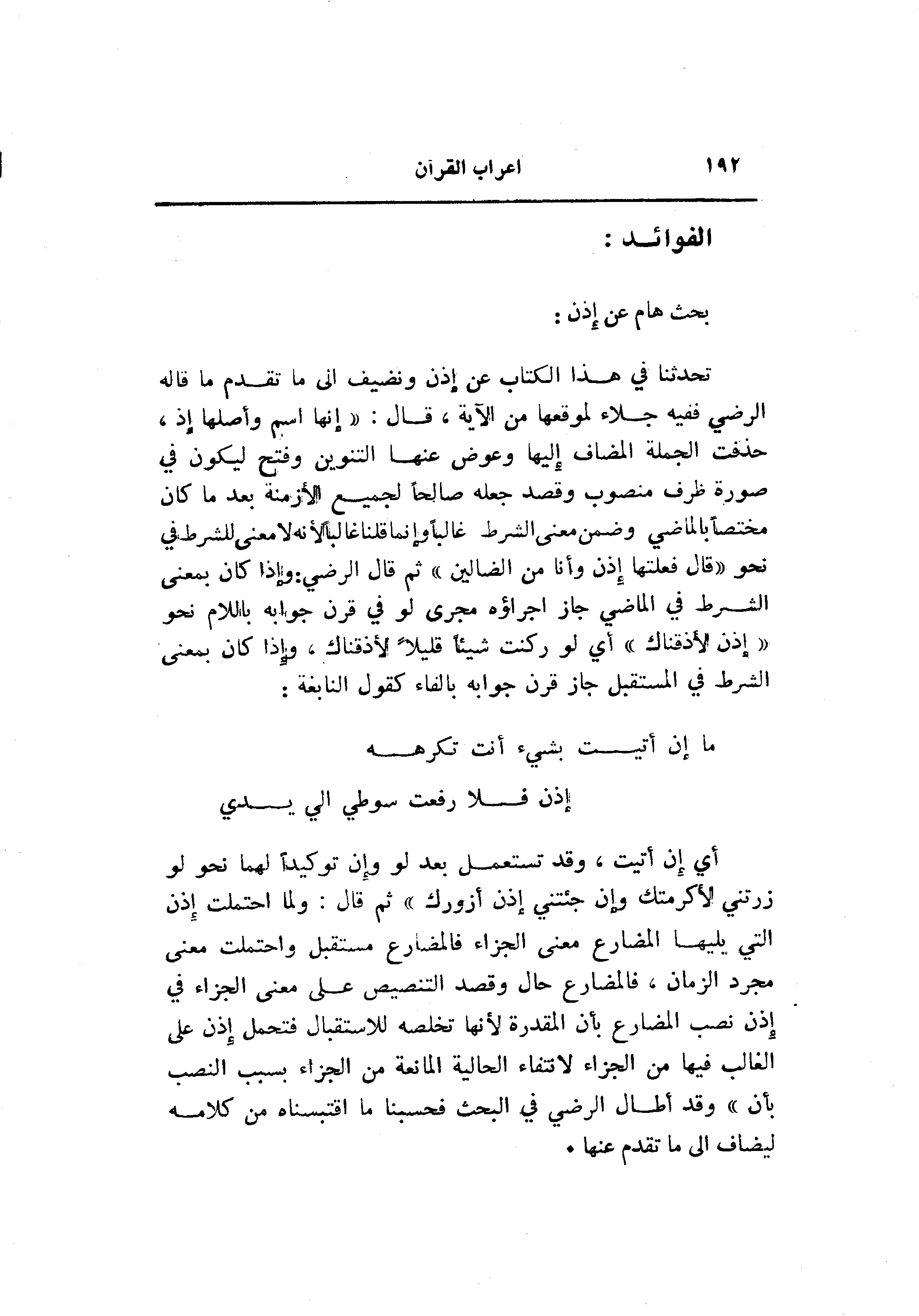 تحدثنا في هذا الكتاب عن إذن ونضيف الى ما تقدم ما قاله الرضي ففيه جلاء لموقعها من الآية، قال: «إنها اسم وأصلها إذ، حذفت الجملة المضاف إليها وعوض عنها التنوين وفتح ليكون في صورة ظرف منصوب وقصد جعله صالحا لجميع الأزمنة بعد ما كان مختصا بالماضي وضمن معنى الشرط غالبا وإنما قلنا غالبا لأنه لا معنى للشرط في نحو «قال فعلتها إذن وأنا من الضالين» ثم قال الرضي: وإذا كان بمعنى الشرط في الماضي جاز اجراؤه مجرى لو في قرن جوابه باللام نحو «إذن لأذقناك» أي لو ركنت شيئا قليلا لأذقناك، وإذا كان بمعنى الشرط في المستقبل جاز قرن جوابه بالفاء كقول النابغة: