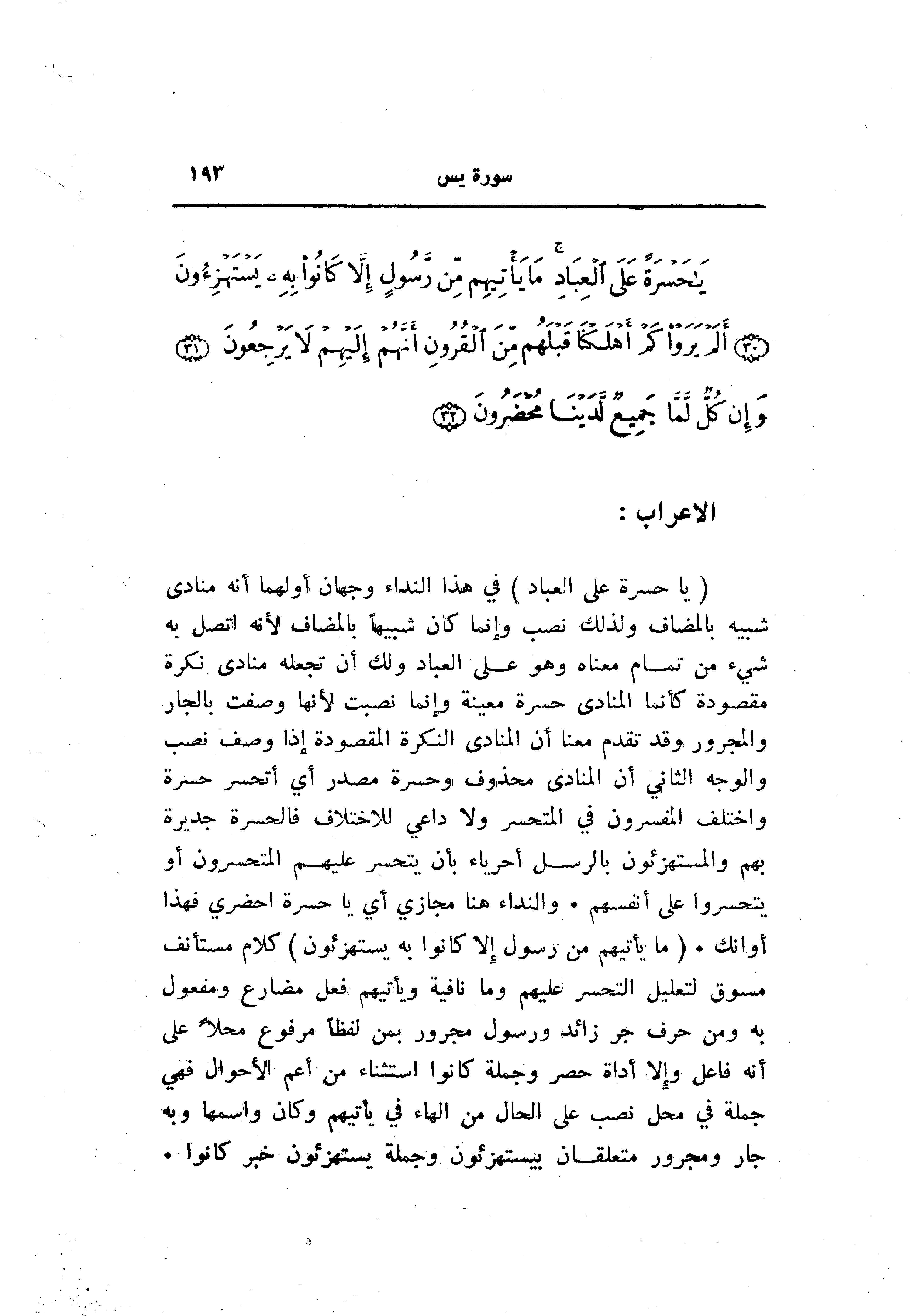 (يا حَسْرَةً عَلَى الْعِبادِ) في هذا النداء وجهان أولهما أنه منادى شبيه بالمضاف ولذلك نصب وإنما كان شبيها بالمضاف لأنه اتصل به شيء من تمام معناه وهو على العباد ولك أن تجعله منادى نكرة مقصودة كأنما المنادى حسرة معينة وإنما نصبت لأنها وصفت بالجار والمجرور وقد تقدم معنا أن المنادى النكرة المقصودة إذا وصف نصب والوجه الثاني أن المنادى محذوف وحسرة مصدر أي أتحسر حسرة واختلف المفسرون في المتحسر ولا داعي للاختلاف فالحسرة جديرة بهم والمستهزءون بالرسل أحرياء بأن يتحسر عليهم المتحسرون أو يتحسروا على أنفسهم. والنداء هنا مجازي أي يا حسرة احضري فهذا أوانك. (ما يَأْتِيهِمْ مِنْ رَسُولٍ إِلَّا كانُوا بِهِ يَسْتَهْزِؤُنَ) كلام مستأنف مسوق لتعليل التحسر عليهم وما نافية ويأتيهم فعل مضارع ومفعول به ومن حرف جر زائد ورسول مجرور بمن لفظا مرفوع محلا على أنه فاعل وإلا أداة حصر وجملة كانوا استثناء من أعم الأحوال فهي جملة في محل نصب على الحال من الهاء في يأتيهم وكان واسمها وبه جار ومجرور متعلقان بيستهزئون وجملة يستهزئون خبر كانوا.