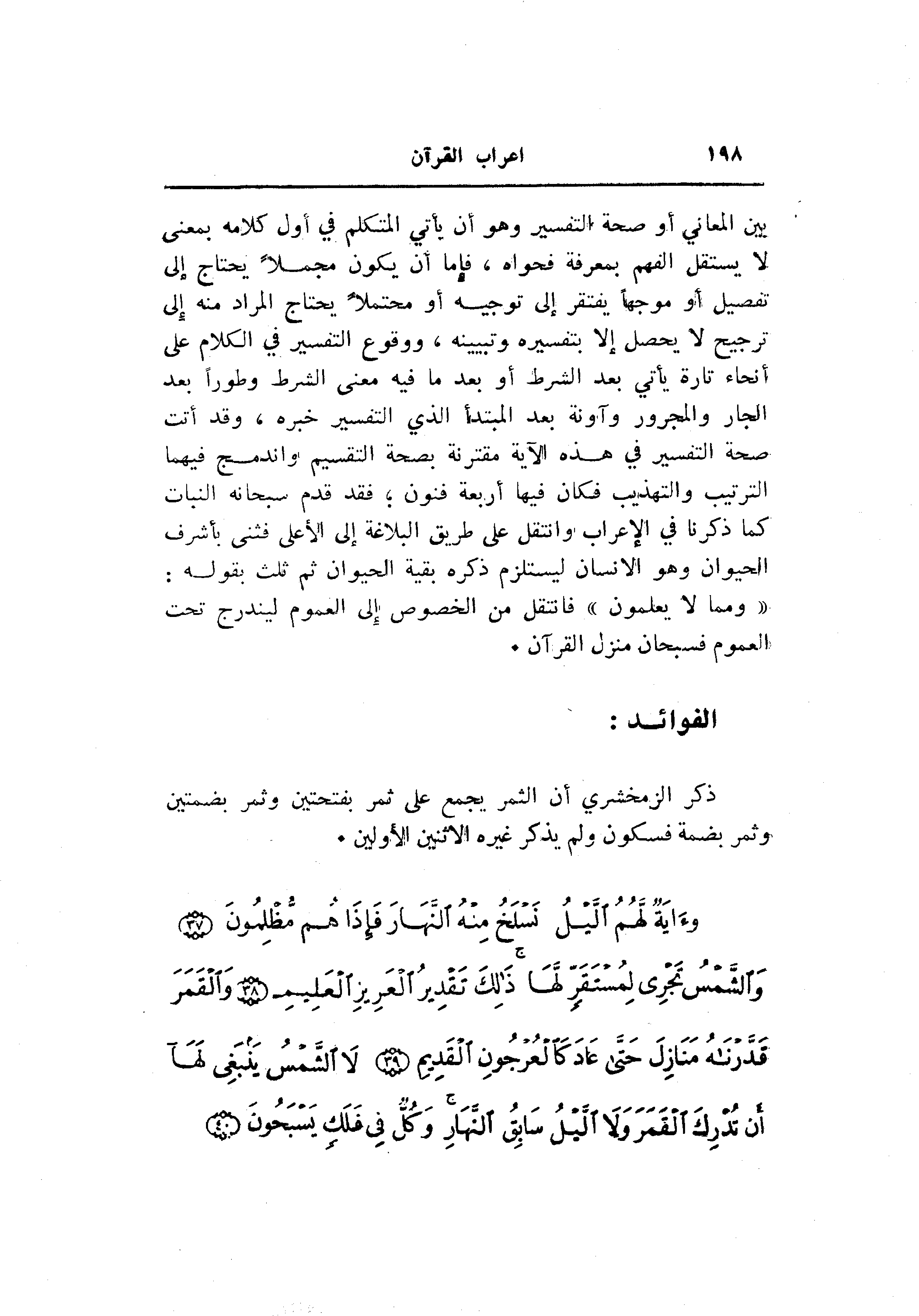 بين المعاني أو صحة التفسير وهو أن يأتي المتكلم في أول كلامه بمعنى لا يستقل الفهم بمعرفة فحواه، فإما أن يكون مجملا يحتاج إلى تفصيل أو موجها يفتقر إلى توجيه أو محتملا يحتاج المراد منه إلى ترجيح لا يحصل إلا بتفسيره وتبيينه، ووقوع التفسير في الكلام على أنحاء تارة يأتي بعد الشرط أو بعد ما فيه معنى الشرط وطورا بعد الجار والمجرور وآونة بعد المبتدأ الذي التفسير خبره، وقد أتت صحة التفسير في هذه الآية مقترنة بصحة التقسيم واندمج فيهما الترتيب والتهذيب فكان فيها أربعة فنون فقد قدم سبحانه النبات كما ذكرنا في الإعراب وانتقل على طريق البلاغة إلى الأعلى فثنى بأشرف الحيوان وهو الإنسان ليستلزم ذكره بقية الحيوان ثم ثلث بقوله: